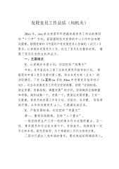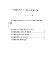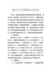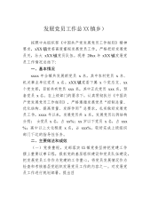 2021年上半年发展党员工作总结今年来,我县认真贯彻执行新时期发展党员“控制总量、优化结构、提高质量、发挥作用”的十六字方针,认真贯彻党的十九大提出的“发展党员必须把政治标准放在首位”“注重从产业工人、青年农民、高知识群体中和在非公有制经济组织、社会组织中发展党员”的要求,坚决遏制“唯亲唯近”、“近亲繁殖”等农村发展党员“家族化”“裙带化”不良现象,进一步规范发展党员工作程序,进一步严格发展党员审核备案,进一步压实发展党员工作责任,切实把好发展党员的“入口”,不断提高发展党员的质量。一、基本情况全县共有XXX镇,X个建制村,X个村改X区,XXX县X区。共建有党的基层组织X个,其XX镇党委X个,...