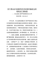 党工委会议专题听取党员发展对象政治表现情况汇报制度——天台县直工委严把发展党员入口关发布日期:2020-08-03今年以来,天台县委直属机关工委严格落实党工委会议专题听取党员发展对象政治表现情况汇报制度,抓实人选摸底考察、强化过筛研判审批、注重全程培养监督,确保高质量发展党员,不断夯实基层党建工作基础。截至目前,已召开专题汇报会3场,审核党员发展对象55名,2名发展对象被暂缓发展,其中重审通过1名,暂不发展1名。一、绘准人选画像,着力解决发展党员考察不深、了解不够的问题。聚焦政治表现开展“人、事、档”全方位审查,以干部考察的要求考准考实发展对象,确保人选素质全面过硬。一是审核“严一点”。制定“...