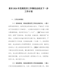 某市2024年发展党员工作情况总结及下一步工作计划一、工作总体情况(一)坚持标准,保持发展党员工作的正确方向。一是坚持贯彻党章规定。始终把政治标准放在首位,严格执行《中国共产党发展党员工作细则》,认真落实发展党员工作重大问题专题调研制度,把好党员队伍“入口关”。二是严格执行发展程序。按照“坚持标准、保证质量、改善结构、慎重发展”的要求,认真制定并实施年度党员发展计划,遵循组织程序,严肃发展党员工作纪律,切实做到成熟一个发展一个,把准思想教育、政治审查和公开透明等程序,坚决避免走过场、搞形式,坚决防止入党上的投机和趋利等行为。三是着力提高保证质量。不断优化党员队伍结构,强化教育培养,坚持把政治标...