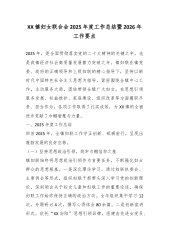 XX经开区妇联2025年工作总结暨2026年工作部署专题会议上的讲话(精品)同志们:今天,我们在这里召开XX经开区妇联2025年工作总结暨2026年工作部署专题会议,主要任务是深入学习贯彻习近平新时代中国特色社会主义思想,认真落实习近平总书记关于妇女儿童和妇联工作、关于注重家庭家教家风建设的重要论述,系统总结过去一年全区妇联工作成效,科学谋划新一年发展蓝图,进一步动员广大妇联干部团结奋进、真抓实干,为XX经开区现代化建设贡献巾帼力量。一、2025年工作回顾2025年,全区各级妇联组织在区党工委和市妇联的坚强领导下,始终坚持服务大局、服务妇女的工作主线,持续深化桥梁纽带作用,在依法维护妇女儿童合法权益、促进女性更高质量创业就业、深化家庭家教家风建设等领域取得了新的突破,各项工作呈现出重点突出、...