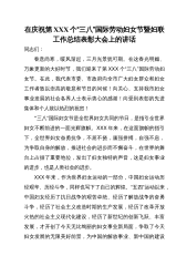 在庆祝第XXX个“三八”国际劳动妇女节暨妇联工作总结表彰大会上的讲话同志们: 春意尚寒,暖风渐起,三月光景犹可期。在这春光明媚、万象更新的大好时节,我们迎来了第XXX个“三八”国际劳动妇女节。在此,我代表市委、市政府向全市广大妇女群众和妇女工作者致以崇高的敬意和节日的问候!向关心、支持我市妇女事业发展的社会各界人士表示衷心的感谢!向受到表彰的先进集体和个人致以热烈的祝贺!“三八”国际妇女节是全世界妇女共同的节日,是指引全世界妇女不断前进的一面光辉旗帜。XXX年来,在这面旗帜的指引下,全世界妇女奋勇抗争,不屈不挠,顽强拼搏,自强不息,为争取自身的解放,推进社会的进步而不懈奋斗,在世界的舞台上占据...
