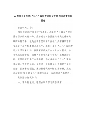 1三八妇女节一封信:口市妇女联合会致全市广大妇女的一封信全市广大妇女姐妹们:春回大地、万象更新。在“三八”国际妇女节来临之际,口市妇联向全市广大妇女致以节日的问候和美好祝愿!向各级妇联干部和妇女工作者们致以诚挚的慰问!向关心支持口妇女事业发展的各级领导和社会各界表示衷心的感谢!巾帼心向党,建功新时代!2021年,是建党100周年,是“十四五”开局之年,是交出口筹办和本地发展两份优异答卷的关键一年,全市广大妇女在各级妇联组织的团结带领下,围绕交好“两份优异答卷”,勇于担当,奋力拼搏,决战决胜,在服务口筹办举办、口“口”建设、创新创业、乡村振兴、创建文明城市、疫情防控等经济社会的各项事业中,充分发...