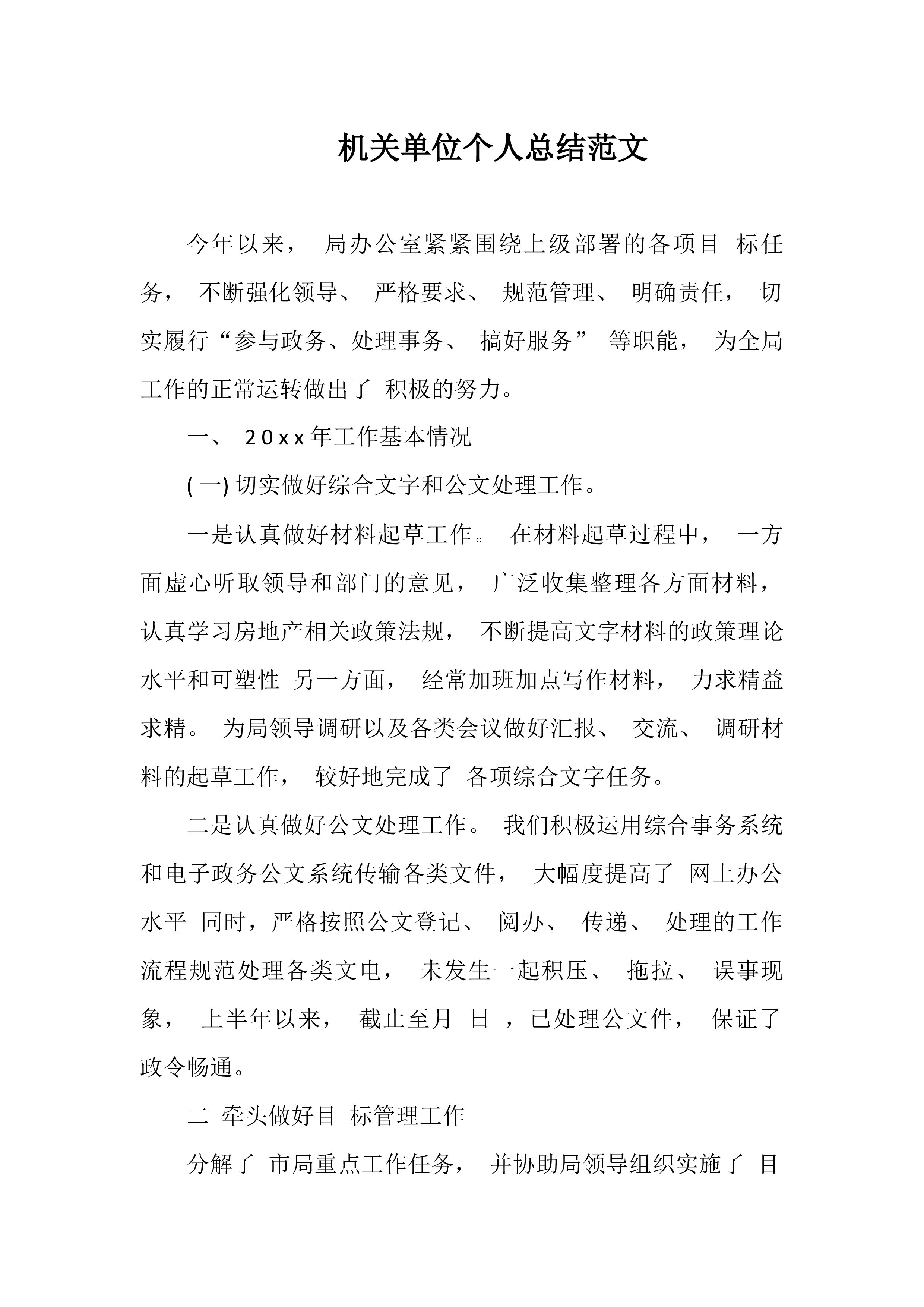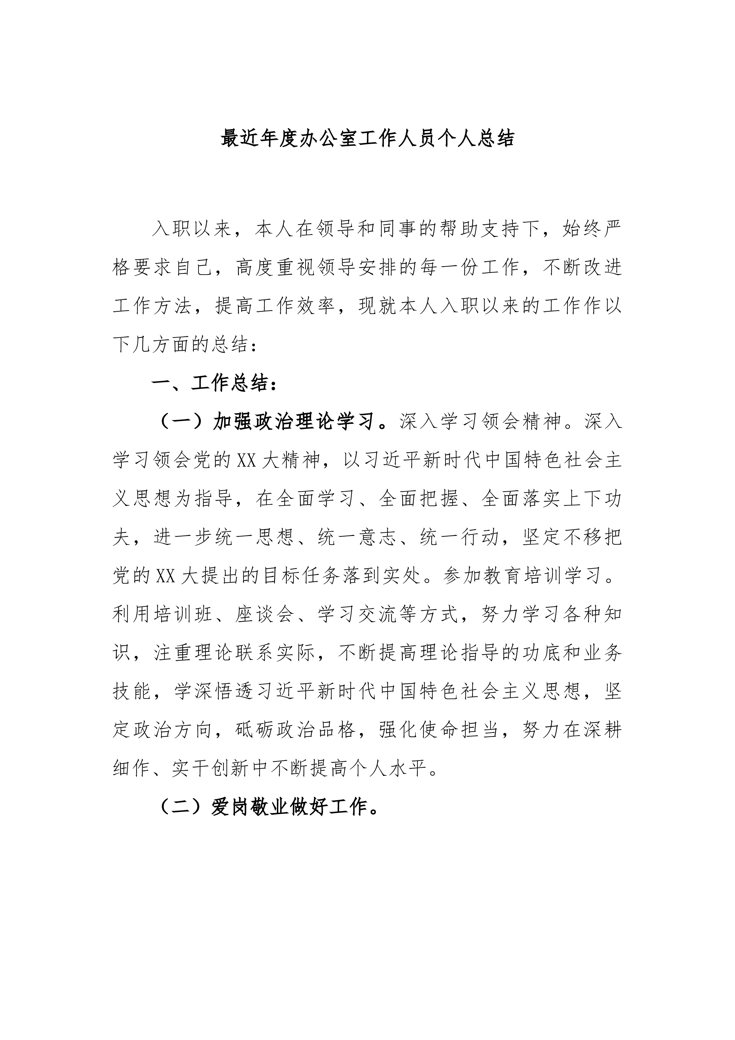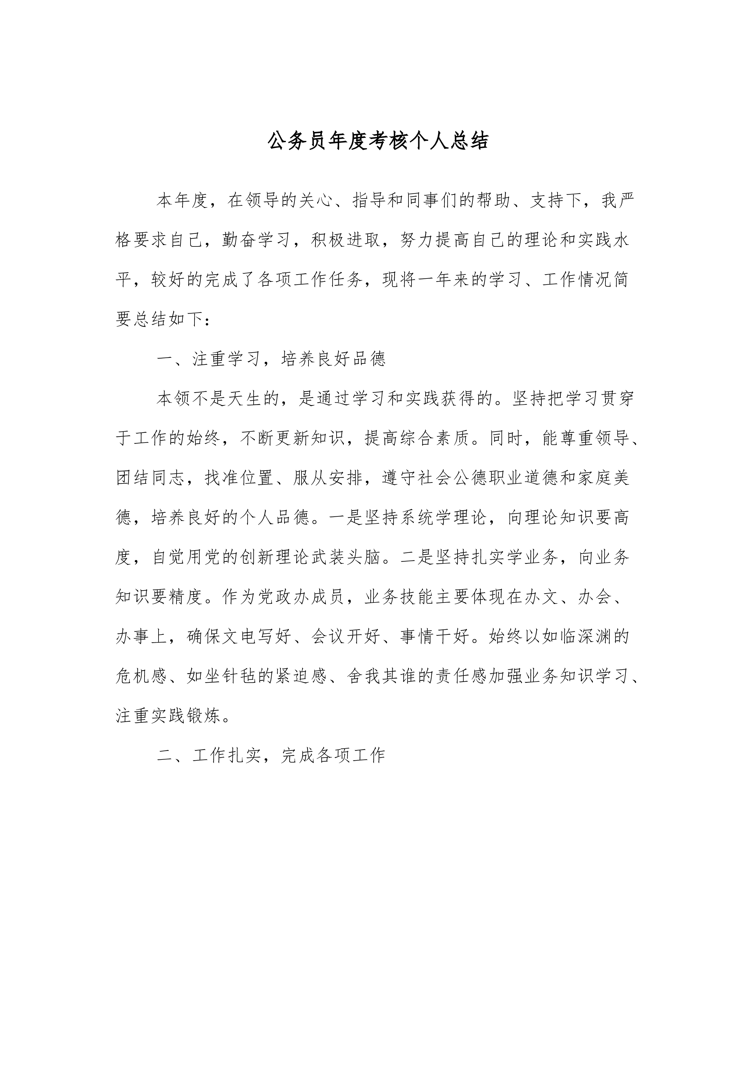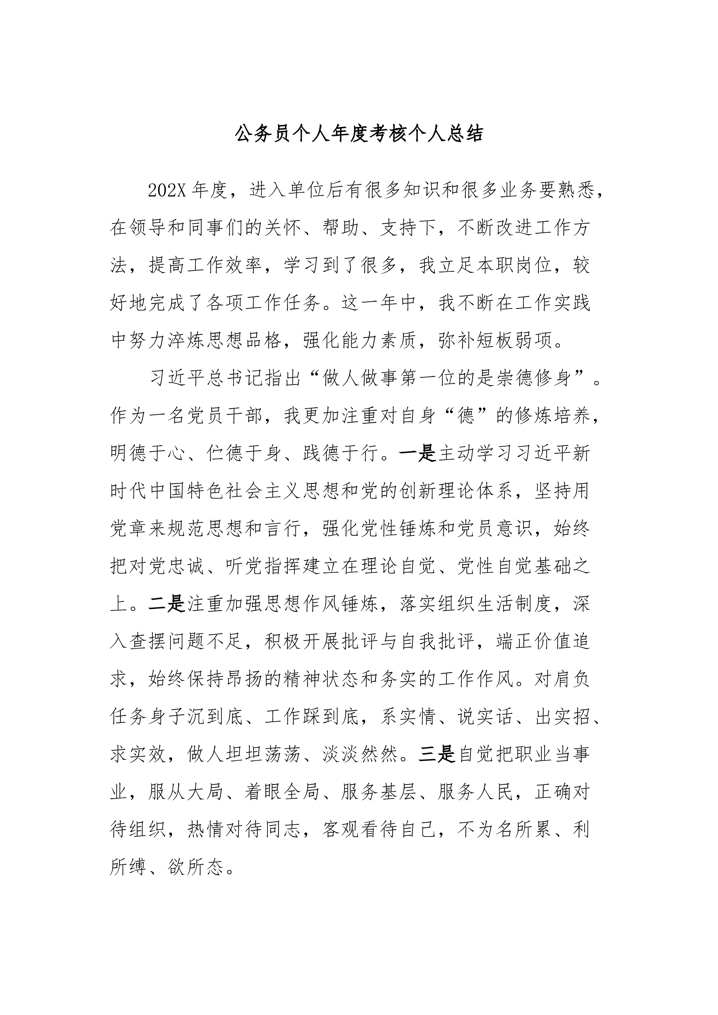 公务员个人年度考核个人总结202X年度,进入单位后有很多知识和很多业务要熟悉,在领导和同事们的关怀、帮助、支持下,不断改进工作方法,提高工作效率,学习到了很多,我立足本职岗位,较好地完成了各项工作任务。这一年中,我不断在工作实践中努力淬炼思想品格,强化能力素质,弥补短板弱项。习近平总书记指出“做人做事第一位的是崇德修身”。作为一名党员干部,我更加注重对自身“德”的修炼培养,明德于心、伫德于身、践德于行。一是主动学习习近平新时代中国特色社会主义思想和党的创新理论体系,坚持用党章来规范思想和言行,强化党性锤炼和党员意识,始终把对党忠诚、听党指挥建立在理论自觉、党性自觉基础之上。二是注重加强思想作风...