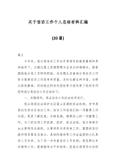关于信访工作个人总结材料汇编(20篇)篇1 今年来,我分局信访工作在市局领导的高度重视和具体指导下,以强化国土资源管理为出发点和落脚点,紧紧围绕我分局工作职责职能,切实强化完善我分局信访工作努力提高信访工作效率和质量,及时化解各种矛盾,为群众排忧解难,促进我区的安定团结等方面发挥了较好作用现将我分局信访工作总结如下: 一、加强领导,保证信访工作依法有序进行。 我分局是依法保护本区国土资源的执法机构,受市局委托负责本区信访工作。信访工作是我们的一项重要工作内容,更是了解民意,反映民情,凝聚民心的一项重要工作。为了把这项工作抓紧、抓好、抓出成效,我分局规定由主管领导全面抓,分管领导负责具体工...
