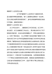 编辑部个人总结范文合集 以下的“编辑部个人总结范文”主题相关内容,是出国留学网特意整理的。每个人都遇到过要制作一些文档,范文让我们的撰写变得更简单了,参考文章能够帮助我们快速打开思路。感谢您的阅读!编辑部个人总结范文篇1 从入学生会至今,,编辑部的工作已经完成。在工作中,各位成员,在几次编辑部工作会议上,我们都认真讨论了关于报纸的详细内容,在各位成员积极配合下,即将出版的报纸比上一次有了更多进步。在上学期部门各成员积极了解部门工作,并参与到工作中,在平时李晶陶春瑶等积极工作并和书记和各老师联系,了解院的信息,及时报道院的情况,在报纸内容上我们做了问卷调查争取将同学们关注的问题更多的在报纸上...