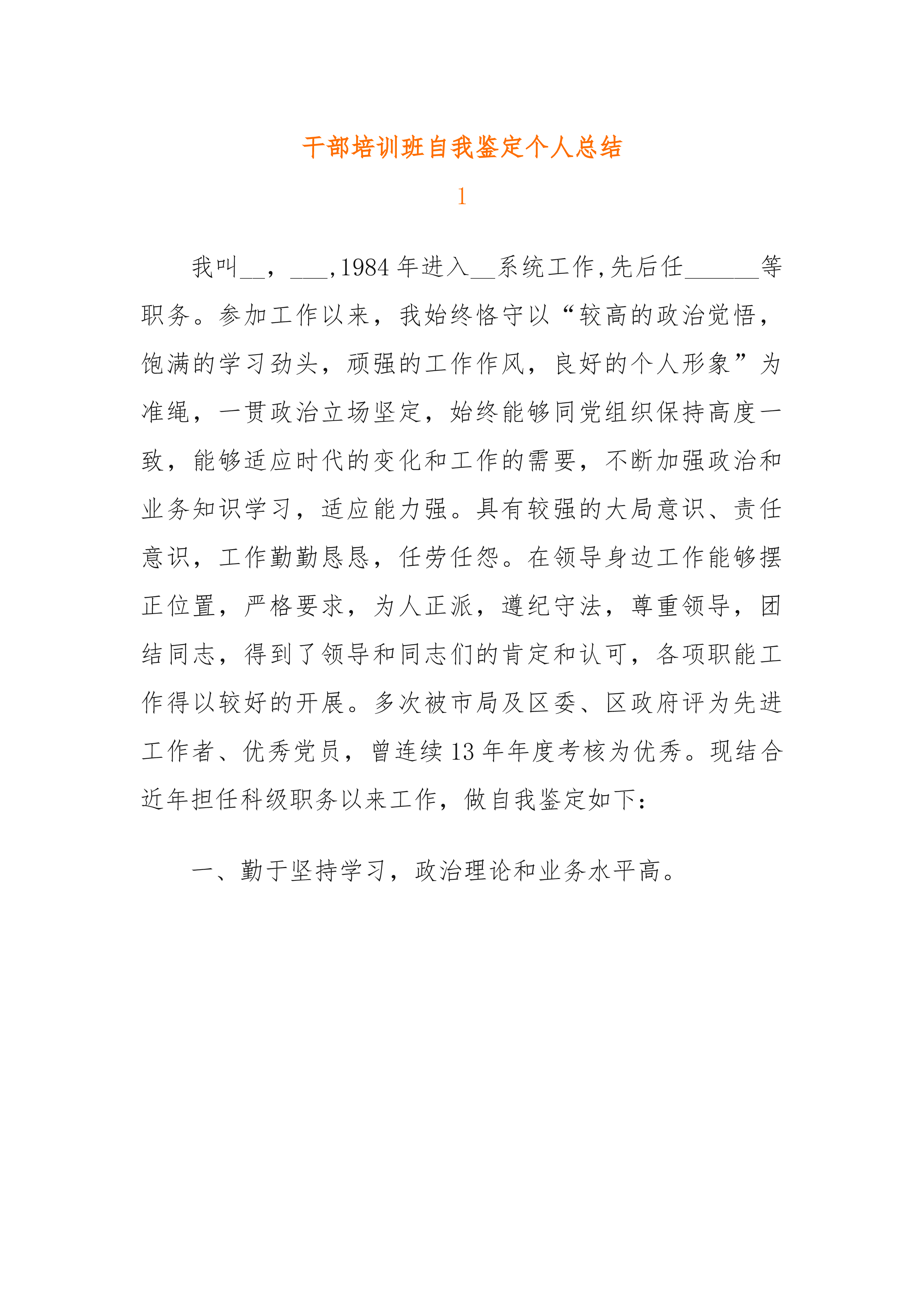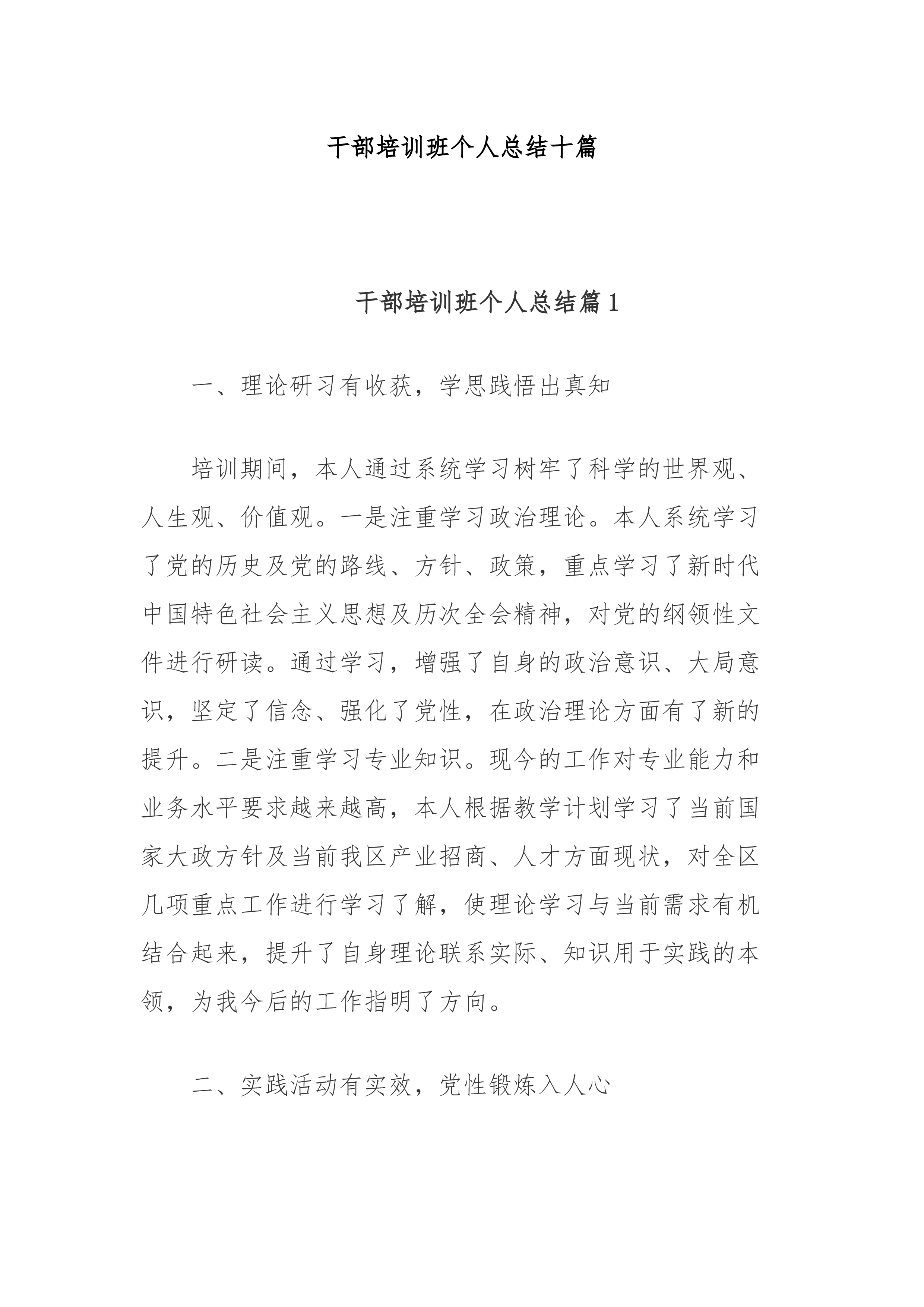 干部培训班个人总结十篇干部培训班个人总结篇1一、理论研习有收获,学思践悟出真知培训期间,本人通过系统学习树牢了科学的世界观、人生观、价值观。一是注重学习政治理论。本人系统学习了党的历史及党的路线、方针、政策,重点学习了新时代中国特色社会主义思想及历次全会精神,对党的纲领性文件进行研读。通过学习,增强了自的政治意识、大局意识,坚定了信念、强化了党性,在政治理论方面有了新的提升。二是注重学习专业知识。现今的工作对专业能力和业务水平要求越来越高,本人根据教学计划学习了当前国家大政方针及当前我区产业招商、人才方面现状,对全区几项重点工作进行学习了解,使理论学习与当前需求有机结合起来,提升了自身理论联系...