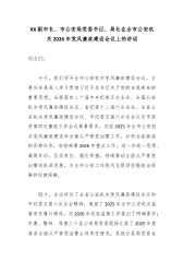 XX州公安局党委书记、局长在州公安机关2026年党风廉政建设暨全面从严管党治警工作会上的讲话同志们: 今天,我们召开全州公安机关党风廉政建设暨全面从严管党治警工作视频会议。这次会议的主要任务是:坚持以习近平新时代中国特色社会主义思想为指导,全面贯彻党的二十大和二十届历次全会精神,深入学习贯彻习近平总书记关于全面从严治党的重要论述和新时代党的建警治警方针,认真贯彻落实州委州政府和省公安厅党委关于党风廉政建设和反腐败工作的部署要求,总结回顾2025年工作,分析当前面临形势,安排部署2026年重点任务,以永远在路上的坚韧执着,纵深推进全面从严管党治警,为全州公安工作现代化和高质量发展提供坚强纪律保障。 刚才,我们传达学习了中央、省委、州委和公安部、省公安厅近期关于全面从严治党的一系列重要会议精...