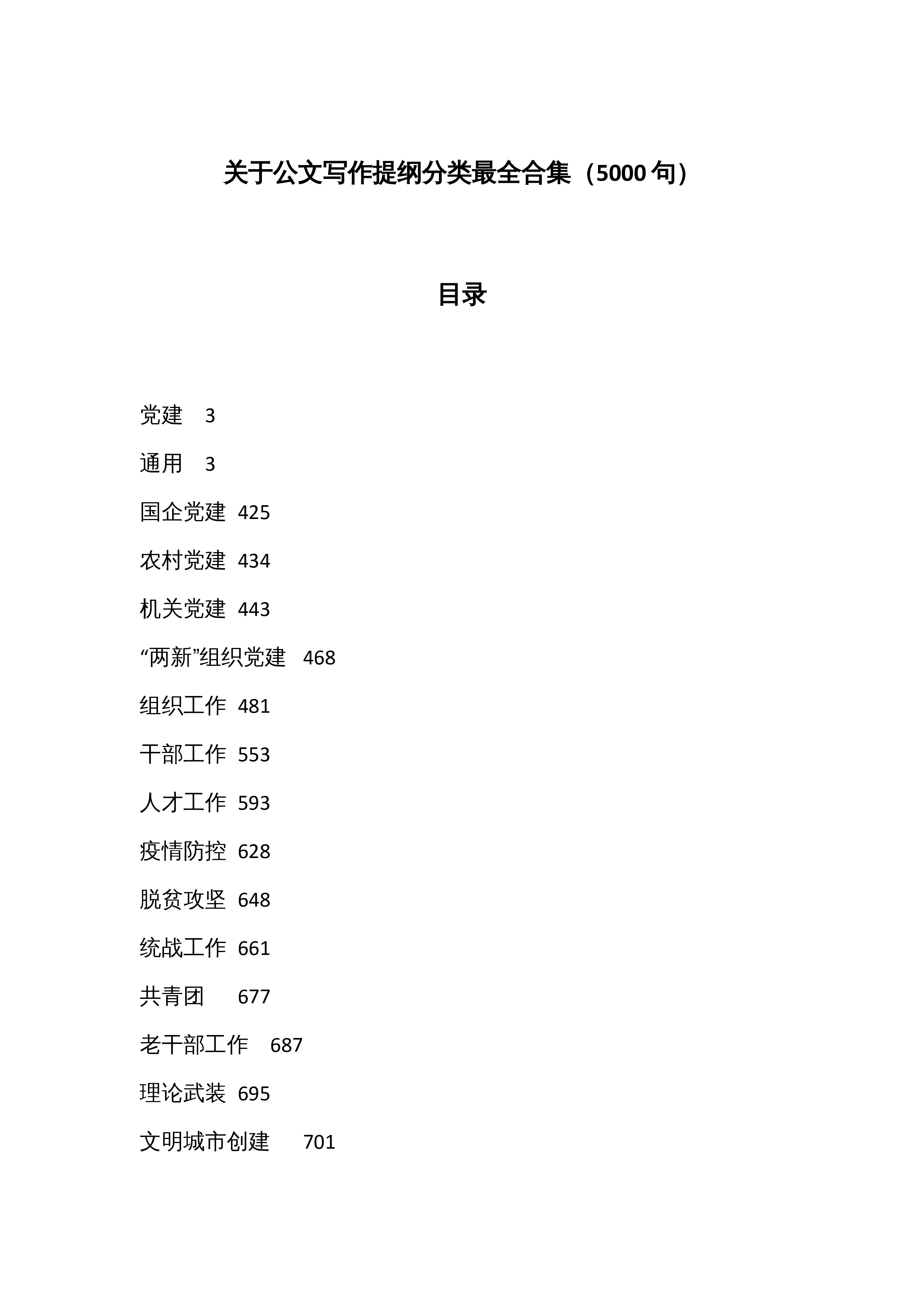 关于公文写作提纲分类最全合集(5000句)目录党建3通用3国企党建425农村党建434机关党建443“两新”组织党建468组织工作481干部工作553人才工作593疫情防控628脱贫攻坚648统战工作661共青团677老干部工作687理论武装695文明城市创建701审计工作712〔抓落实〕733〔力戒形式主义〕〔为基层减负〕740〔斗争〕746纪检监察754关键字(词)763〔发展〕763〔写材料〕771〔督查〕777〔心得体会〕783〔政务工作〕789〔加减乘除〕825〔战〕832〔力〕846〔关〕862〔气〕871〔第一〕879〔心〕887〔度〕896〔起来〕903〔势〕911〔题〕917...
