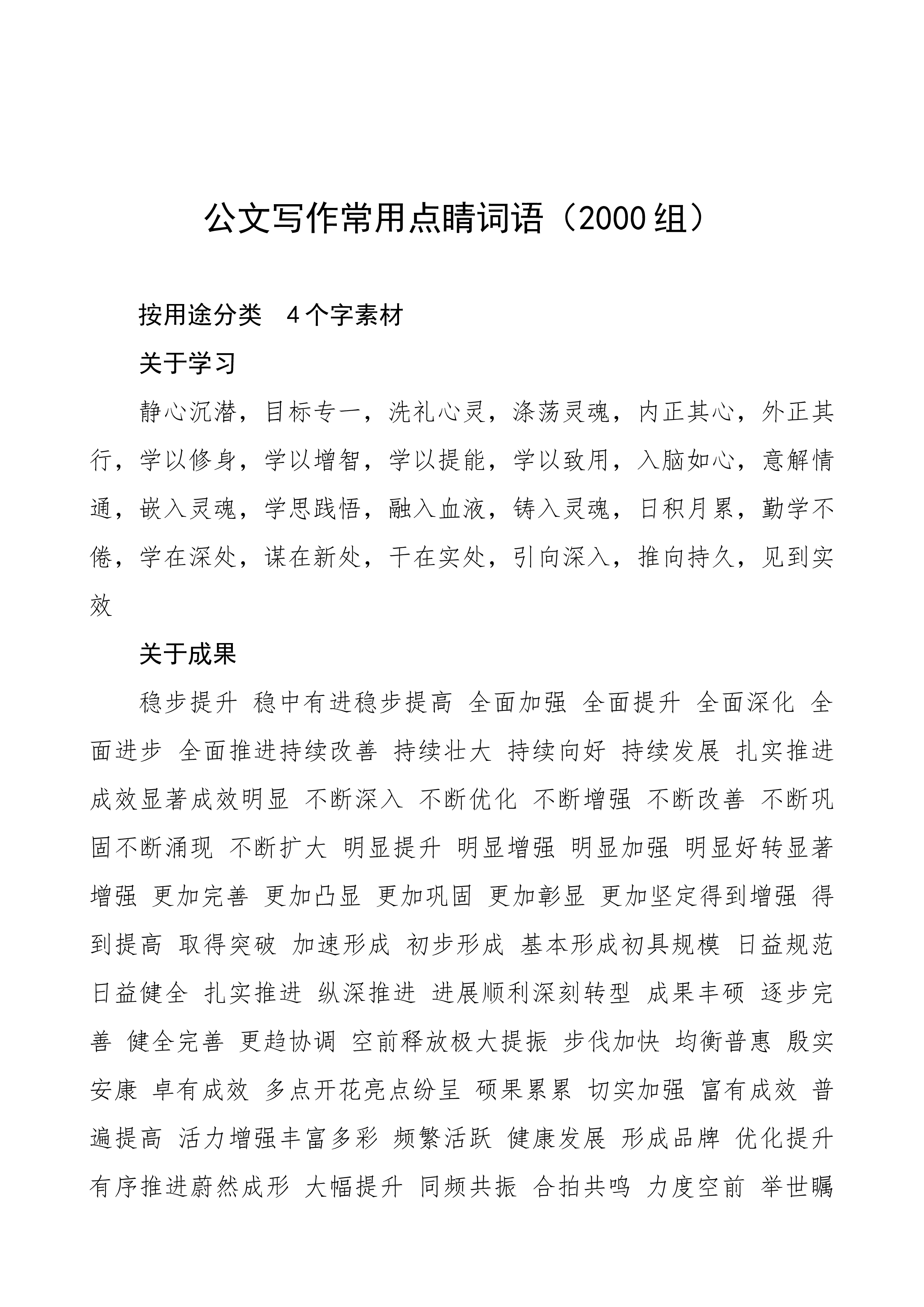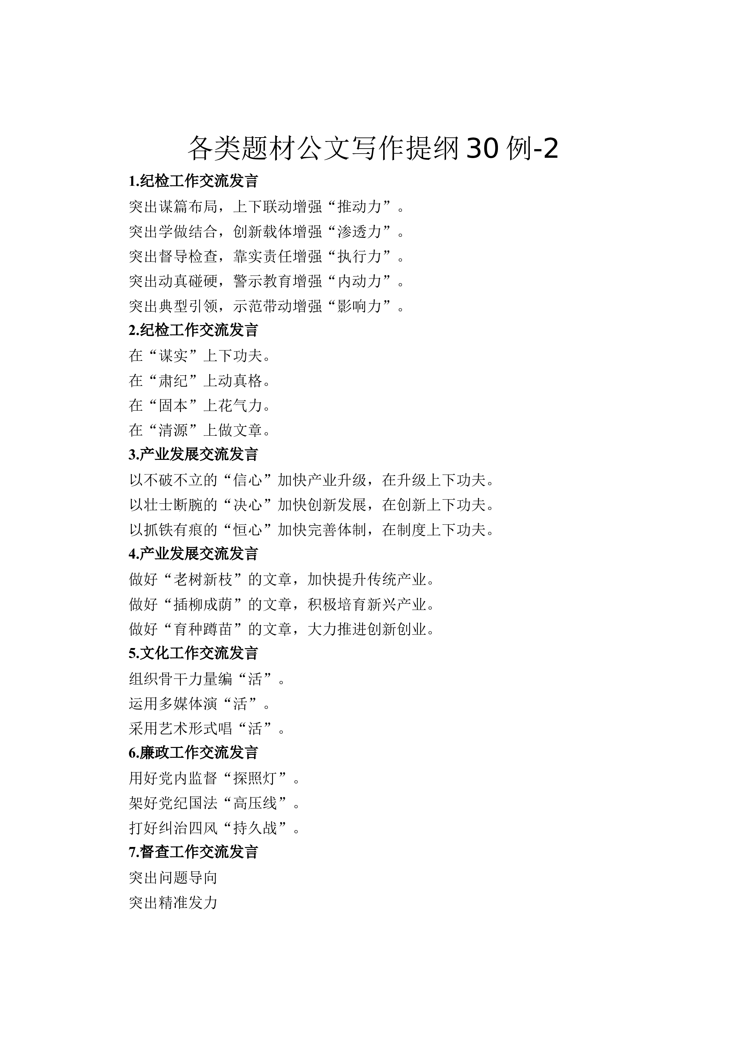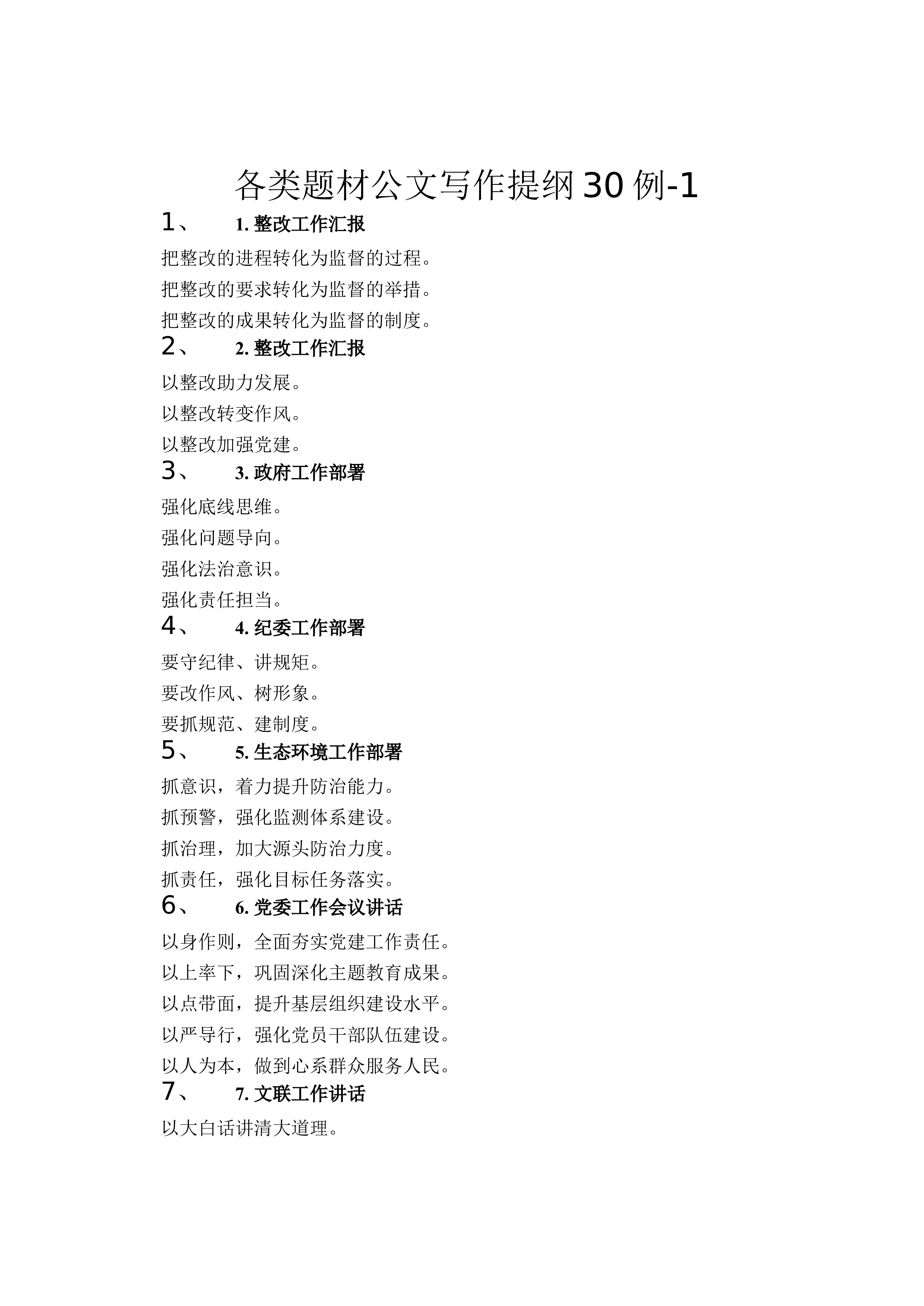各类题材公文写作提纲30例-11、1. 整改工作汇报把整改的进程转化为监督的过程。把整改的要求转化为监督的举措。把整改的成果转化为监督的制度。2、2. 整改工作汇报以整改助力发展。以整改转变作风。以整改加强党建。3、3. 政府工作部署强化底线思维。强化问题导向。强化法治意识。强化责任担当。4、4. 纪委工作部署要守纪律、讲规矩。要改作风、树形象。要抓规范、建制度。5、5. 生态环境工作部署抓意识,着力提升防治能力。抓预警,强化监测体系建设。抓治理,加大源头防治力度。抓责任,强化目标任务落实。6、6. 党委工作会议讲话以身作则,全面夯实党建工作责任。以上率下,巩固深化主题教育成果。以点带面,提升...