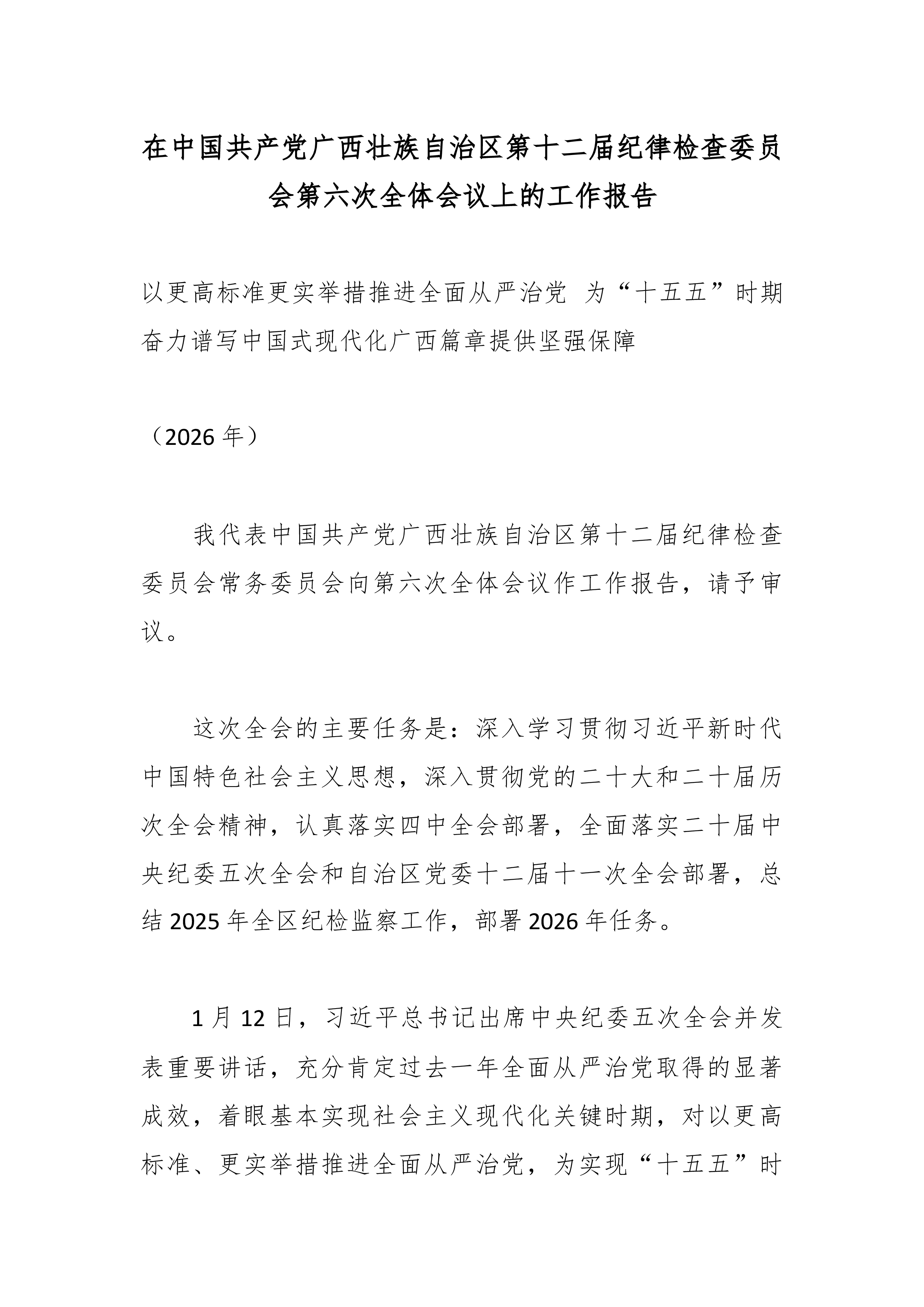 在中国共产党广西壮族自治区第十二届纪律检查委员会第六次全体会议上的工作报告以更高标准更实举措推进全面从严治党为“十五五”时期奋力谱写中国式现代化广西篇章提供坚强保障(2026年) 我代表中国共产党广西壮族自治区第十二届纪律检查委员会常务委员会向第六次全体会议作工作报告,请予审议。 这次全会的主要任务是:深入学习贯彻习近平新时代中国特色社会主义思想,深入贯彻党的二十大和二十届历次全会精神,认真落实四中全会部署,全面落实二十届中央纪委五次全会和自治区党委十二届十一次全会部署,总结2025年全区纪检监察工作,部署2026年任务。 1月12日,习近平总书记出席中央纪委五次全会并发表重要讲话,充分肯定过去一年全面从严治党取得的显著成效,着眼基本实现社会主义现代化关键时期,对以更高标准、更实举措推...
