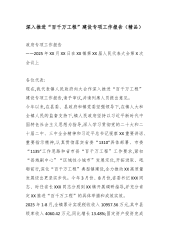 深入推进“百千万工程”建设专项工作报告(精品)政府专项工作报告——2025年XX月XX日在XX镇第XX届人民代表大会第X次会议上各位代表:现在,我代表镇人民政府向大会作深入推进“百千万工程”建设专项工作报告,请予审议,并请列席人员提出意见。今年以来,在县委、县政府和镇党委坚强领导下,在镇人大和全镇人民的监督支持下,镇人民政府坚持以习近平新时代中国特色社会主义思想为指导,深入学习贯彻党的二十大和二十届二中、三中全会精神和习近平总书记视察XX重要讲话、重要指示精神,认真贯彻落实省委“1310”具体部署、市委“1135”工作思路和省市县“百千万工程”工作要求,紧扣“县域副中心”“区域性小城市”发展定位,开拓进取、砥砺前行,深化“百千万工程”典型镇建设,全力推动XX高质量发展迈出更坚实步伐。今年3月...