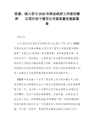 党课:深入学习2026年两会政府工作报告精神以笃行实干谱写公司高质量发展新篇章同志们:今天,我们在这里召开支部党员大会,我以“深入学习2026年两会政府工作报告精神,以笃行实干谱写公司高质量发展新篇章”为题,为大家讲授一堂专题党课。目的就是要在第一时间传达学习、深刻领会、全面贯彻今年全国两会的精神,特别是政府工作报告中蕴含的重大判断、战略部署和实践要求,切实把我们全体党员的思想和行动统一到党中央的决策部署上来,统一到推动公司实现更高质量发展的具体实践中来。2026年是实施“十五五”规划承上启下的关键之年,也是我们国家在全面建设社会主义现代化国家新征程上具有里程碑意义的一年。在这样一个关键节点召开的全国两会,举国关注、世界瞩目。政府工作报告高屋建瓴、内涵丰富、求真务实,系统总结了过去一年的辉煌...