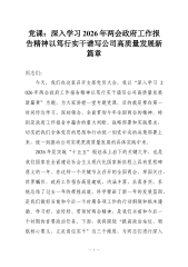 党课:深入学习2026年两会政府工作报告精神以笃行实干谱写公司高质量发展新篇章同志们:今天,我们在这里召开支部党员大会,我以“深入学习 2026年两会政府工作报告精神以笃行实干谱写公司高质量发展新篇章”为题,为大家讲授一堂专题党课。目的就是要在第一时间传达学习、深刻领会、全面贯彻今年全国两会的精神,特别是政府工作报告中蕴含的重大判断、战略部署和实践要求,切实把我们全体党员的思想和行动统一到党中央的决策部署上来,统一到推动公司实现更高质量发展的具体实践中来。2026年是实施“十五五”规划承上启下的关键之年,也是我们国家在全面建设社会主义现代化国家新征程上具有里程碑意义的一年。在这样一个关键节点召开的全国两会,举国关注、世界瞩目。政府工作报告高屋建瓴、内涵丰富、求真务实,系统总结了过去一年的辉煌...