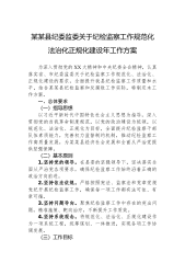 某某县纪委监委关于纪检监察工作规范化法治化正规化建设年工作方案为深入贯彻党的XX大精神和中央纪委全会精神,认真落实省、市纪委监委关于纪检监察工作规范化、法治化、正规化建设的要求,全面提升我县纪检监察工作质量和水平,结合某某县纪检监察和反腐败工作实际,特制定本工作方案。一、总体要求(一)指导思想以习近平新时代中国特色社会主义思想为指导,深入贯彻党的自我革命制度规范,以党的政治建设为统领,以规范化、法治化、正规化为目标,全面提升纪检监察干部队伍素质能力,完善权力监督制约机制,推动纪检监察工作高质量发展,为某某县经济社会发展和全面从严治党提供坚强保障。(二)基本原则1.坚持党的领导。在县委的坚强领导下,坚决落实全面从严治党各项要求,确保纪检监察工作始终沿着正确的政治方向前进。2.坚持依法依规。严格...