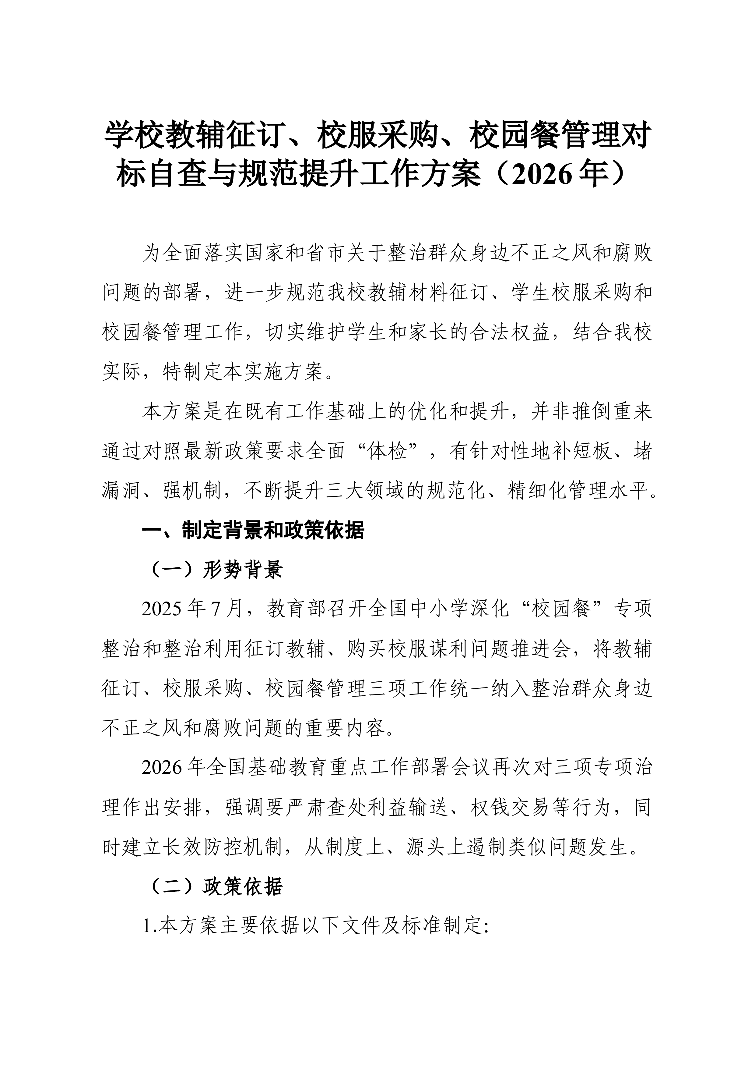 学校教辅征订、校服采购、校园餐管理对标自查与规范提升工作方案(2026年)为全面落实国家和省市关于整治群众身边不正之风和腐败问题的部署,进一步规范我校教辅材料征订、学生校服采购和校园餐管理工作,切实维护学生和家长的合法权益,结合我校实际,特制定本实施方案。本方案是在既有工作基础上的优化和提升,并非推倒重来通过对照最新政策要求全面“体检”,有针对性地补短板、堵漏洞、强机制,不断提升三大领域的规范化、精细化管理水平。一、制定背景和政策依据(一)形势背景2025年7月,教育部召开全国中小学深化“校园餐”专项整治和整治利用征订教辅、购买校服谋利问题推进会,将教辅征订、校服采购、校园餐管理三项工作统一纳入整治群众身边不正之风和腐败问题的重要内容。2026年全国基础教育重点工作部署会议再次对三项专项治理...