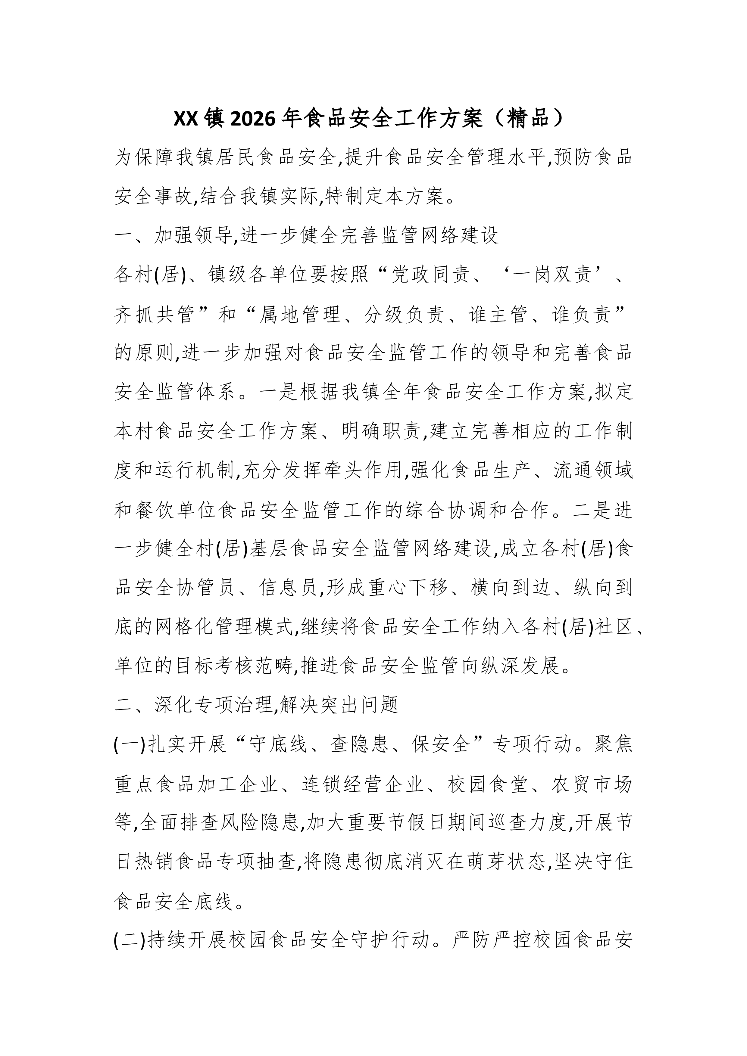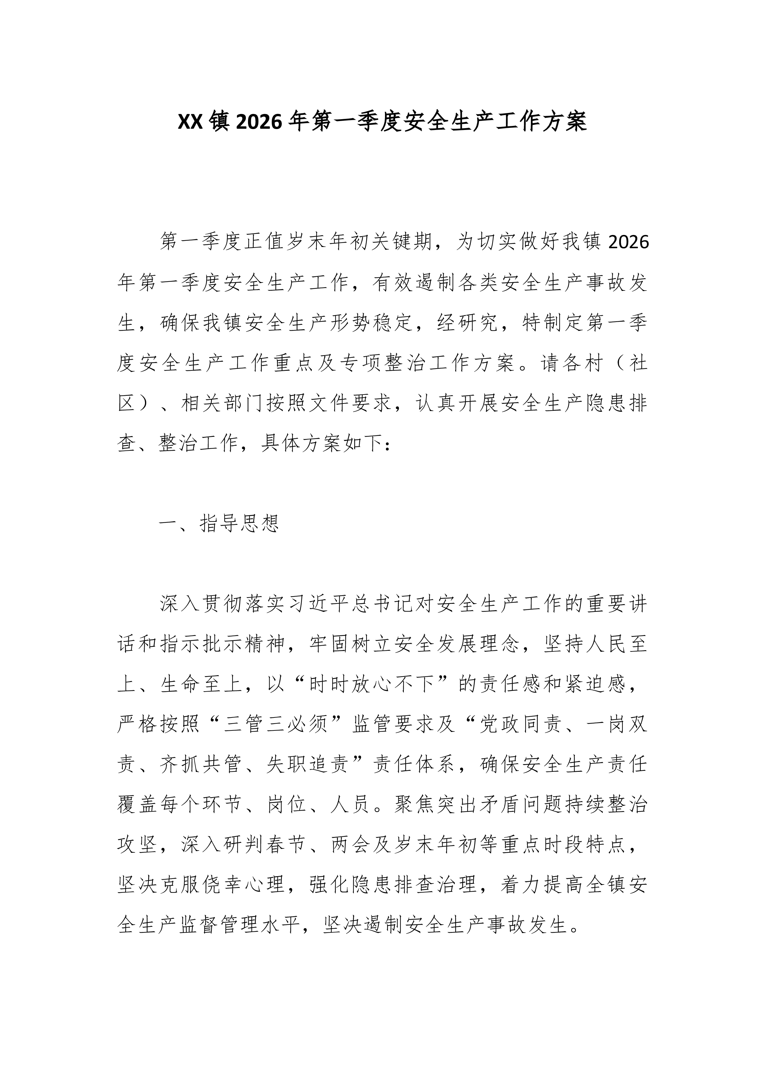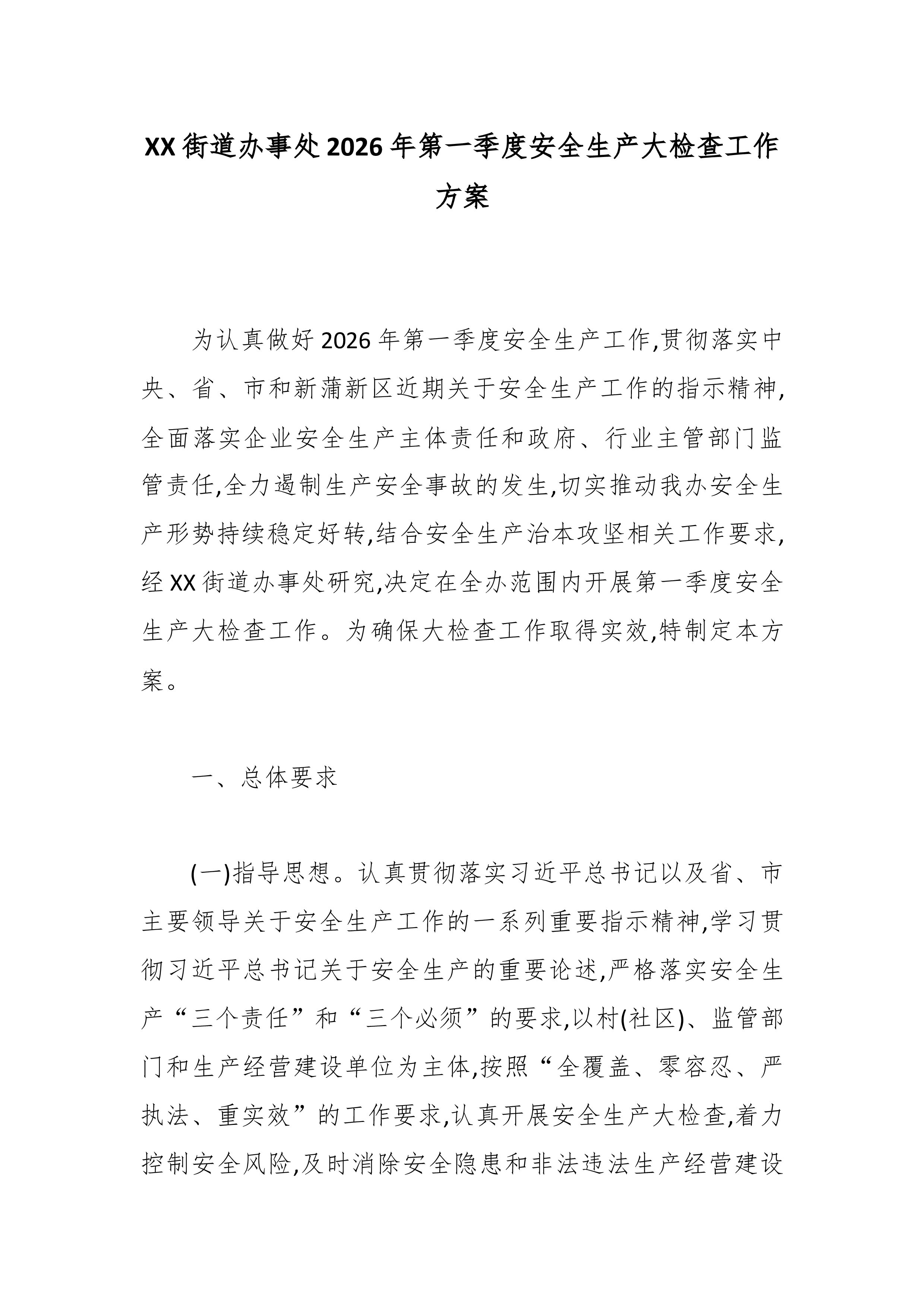 XX街道办事处2026年第一季度安全生产大检查工作方案 为认真做好2026年第一季度安全生产工作,贯彻落实中央、省、市和新蒲新区近期关于安全生产工作的指示精神,全面落实企业安全生产主体责任和政府、行业主管部门监管责任,全力遏制生产安全事故的发生,切实推动我办安全生产形势持续稳定好转,结合安全生产治本攻坚相关工作要求,经XX街道办事处研究,决定在全办范围内开展第一季度安全生产大检查工作。为确保大检查工作取得实效,特制定本方案。 一、总体要求 (一)指导思想。认真贯彻落实习近平总书记以及省、市主要领导关于安全生产工作的一系列重要指示精神,学习贯彻习近平总书记关于安全生产的重要论述,严格落实安全生产“三个责任”和“三个必须”的要求,以村(社区)、监管部门和生产经营建设单位为主体,按照“全覆盖...
