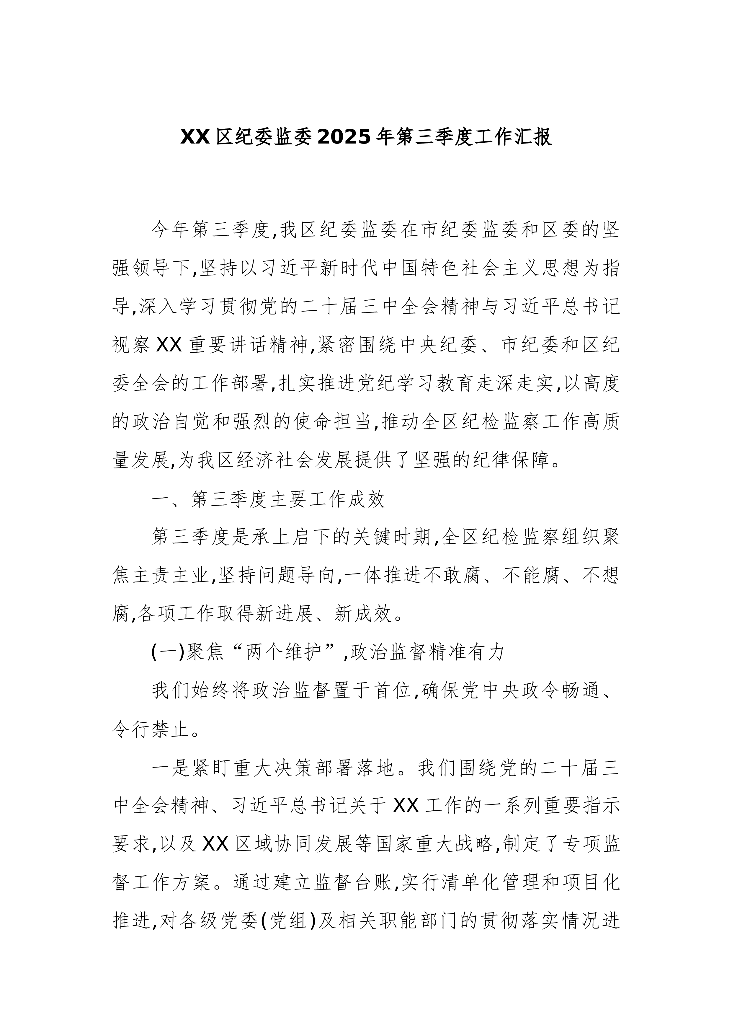 XX区纪委监委2025年第三季度工作汇报今年第三季度,我区纪委监委在市纪委监委和区委的坚强领导下,坚持以习近平新时代中国特色社会主义思想为指导,深入学习贯彻党的二十届三中全会精神与习近平总书记视察XX重要讲话精神,紧密围绕中央纪委、市纪委和区纪委全会的工作部署,扎实推进党纪学习教育走深走实,以高度的政治自觉和强烈的使命担当,推动全区纪检监察工作高质量发展,为我区经济社会发展提供了坚强的纪律保障。一、第三季度主要工作成效第三季度是承上启下的关键时期,全区纪检监察组织聚焦主责主业,坚持问题导向,一体推进不敢腐、不能腐、不想腐,各项工作取得新进展、新成效。(一)聚焦“两个维护”,政治监督精准有力我们始终将政治监督置于首位,确保党中央政令畅通、令行禁止。一是紧盯重大决策部署落地。我们围绕党的二十届三...
