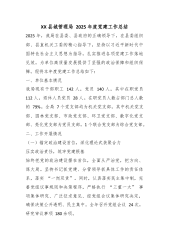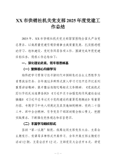 XX市供销社机关党支部2025年度党建工作总结2025年,XX市供销社机关党支部紧紧围绕全面从严治党总要求,以高质量党建引领供销事业高质量发展,扎实推进理论学习、组织建设、党纪作风等各项工作,圆满完成年度党建目标任务,现将工作总结如下:一、深化理论武装,筑牢思想根基(一)聚焦核心内容学习始终把学习贯彻习近平新时代中国特色社会主义思想作为首要政治任务,全年通过多种形式深入学习习近平总书记系列重要讲话精神、集中整治违规吃喝相关文件精神、《党政机关厉行节约反对浪费条例》《习近平关于加强党的作风建设论述摘编》《习近平总书记关于党的建设的重要思想概论》等重要内容。专题学习中央八项规定及其实施细则精神、党的二十届三中、四中全会精神,引导党员干部深刻领会核心要义,把握实践要求,不断强化党性观念和宗旨意识。...