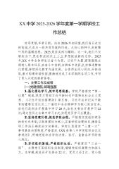 XX中学2025-2026学年度第一学期学校工作总结时序更替,华章日新。站在2026年初回望,我们每日走过的校园,已成为一段共同写就的印迹。从初心的种子,到枝繁叶茂的温暖旅程。2025,是坚实而闪耀的。这一年,我们不仅耕耘当下,更在积淀的沃土上,让梦想绽放新的光彩。2025年,XX中学全体师生以奋斗为笔、以实干为墨,紧紧围绕立德树人根本任务,在奋斗中创新,在耕耘中收获,扎实推进精细化管理,持续深化教育内涵发展。全体师生同心同向,开拓进取,着力构建和谐校园,圆满地完成了本学期的各项工作,书写了育人兴校的崭新答卷。一、主要工作及成绩(一)党建领航,铸魂强基1.强化理论学习,筑牢思想根基。学校严格落实“第一议题”制度,把学习贯彻习近平新时代中国特色社会主义思想、《习近平谈治国理政》第五卷、习近平总...