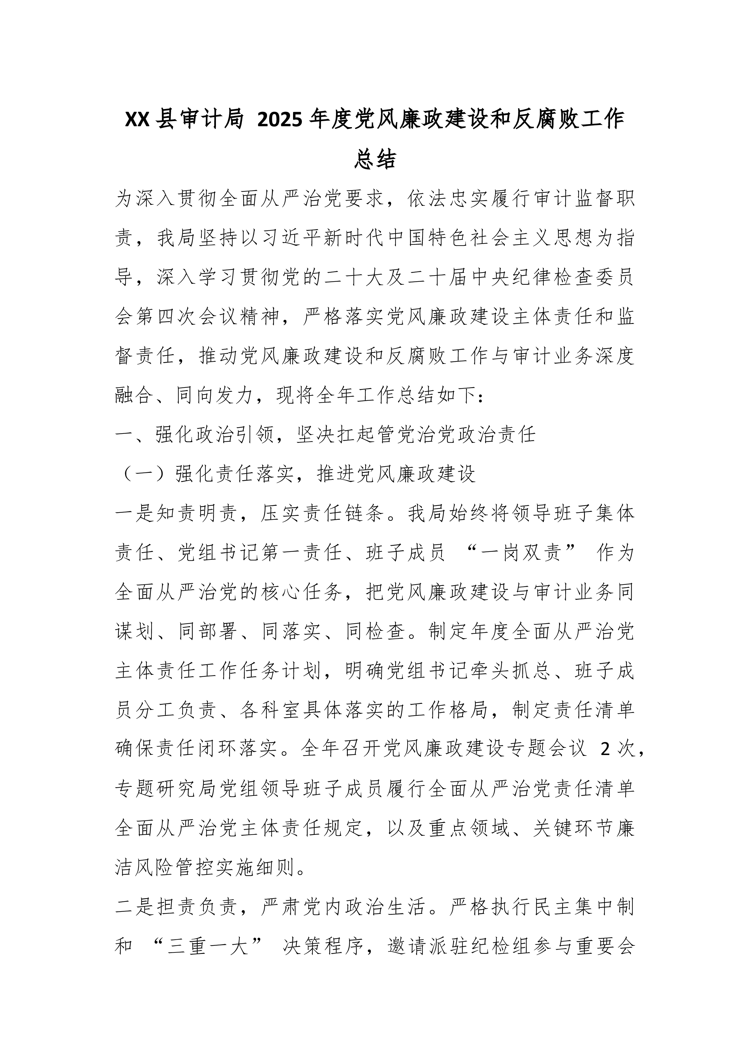 XX县审计局2025年度党风廉政建设和反腐败工作总结为深入贯彻全面从严治党要求,依法忠实履行审计监督职责,我局坚持以习近平新时代中国特色社会主义思想为指导,深入学习贯彻党的二十大及二十届中央纪律检查委员会第四次会议精神,严格落实党风廉政建设主体责任和监督责任,推动党风廉政建设和反腐败工作与审计业务深度融合、同向发力,现将全年工作总结如下:一、强化政治引领,坚决扛起管党治党政治责任(一)强化责任落实,推进党风廉政建设一是知责明责,压实责任链条。我局始终将领导班子集体责任、党组书记第一责任、班子成员“一岗双责”作为全面从严治党的核心任务,把党风廉政建设与审计业务同谋划、同部署、同落实、同检查。制定年度全面从严治党主体责任工作任务计划,明确党组书记牵头抓总、班子成员分工负责、各科室具体落实的工作格...