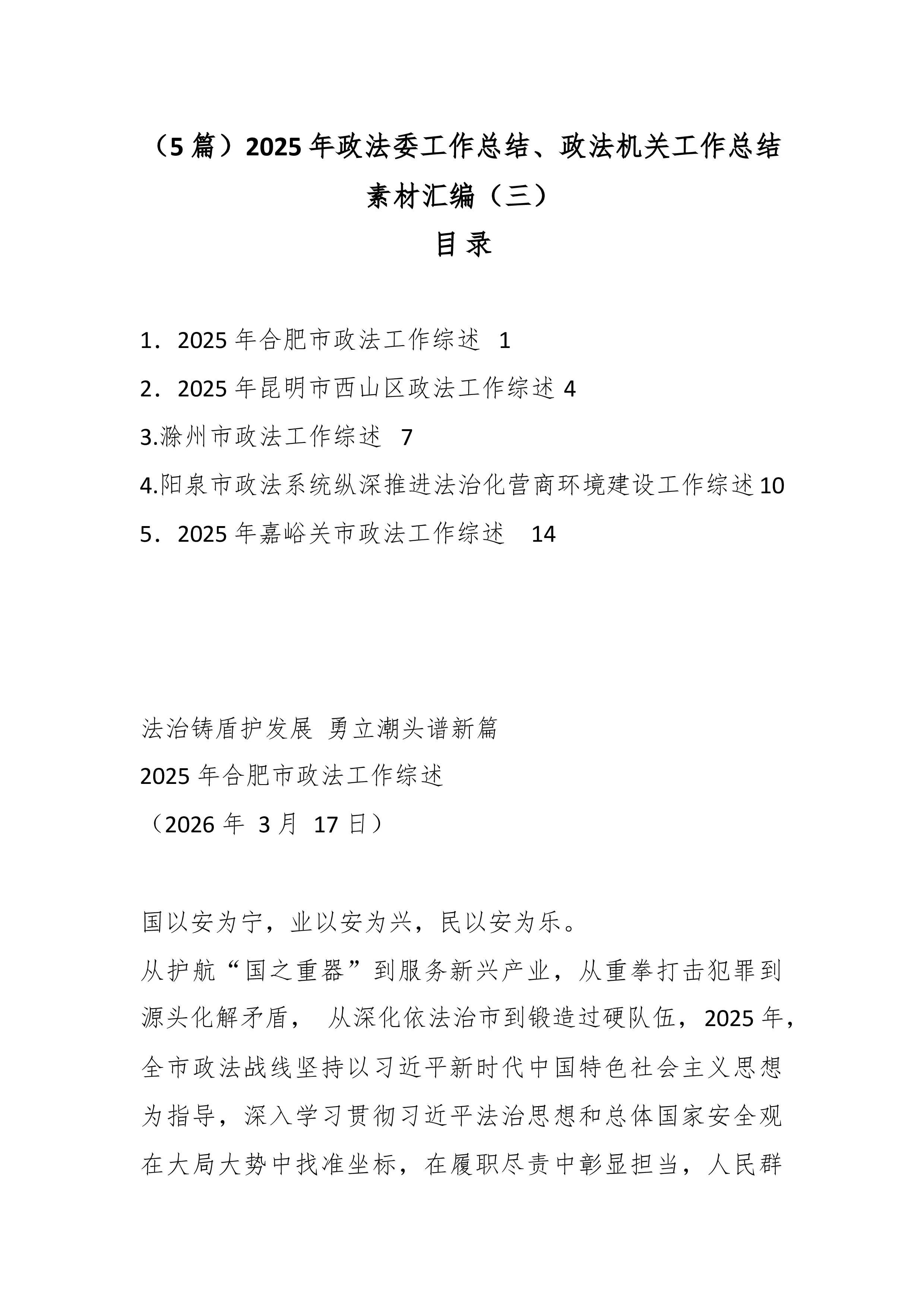 (5篇)2025年政法委工作总结、政法机关工作总结素材汇编(三)目录1.2025年合肥市政法工作综述12.2025年昆明市西山区政法工作综述43.滁州市政法工作综述74.阳泉市政法系统纵深推进法治化营商环境建设工作综述105.2025年嘉峪关市政法工作综述14法治铸盾护发展勇立潮头谱新篇2025年合肥市政法工作综述(2026年3月17日)国以安为宁,业以安为兴,民以安为乐。从护航“国之重器”到服务新兴产业,从重拳打击犯罪到源头化解矛盾,从深化依法治市到锻造过硬队伍,2025年,全市政法战线坚持以习近平新时代中国特色社会主义思想为指导,深入学习贯彻习近平法治思想和总体国家安全观在大局大势中找准坐标,在履职尽责中彰显担当,人民群众的获得感、幸福感、安全感在一项项务实举措中持续增强。一、法治赋能服...