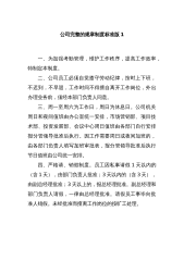公司完整的规章制度标准版1一、为加强考勤管理,维护工作秩序,提高工作效率,特制定本制度。二、公司员工必须自觉遵守劳动纪律,按时上下班,不迟到,不早退,工作时间不得擅自离开工作岗位,外出办理业务前,须经本部门负责人同意。三、周一至周六为工作日,周日为休息日。公司机关周日和夜间值班由办公室统一安排,市场营销部、项目技术部、投资发展部、会议中心周日值班由各部门自行安排报分管领导批准后执行。因工作需要周日或夜间加班的,由各部门负责人填写加班审批表,报分管领导批准后执行节日值班由公司统一安排。四、严格请、销假制度。员工因私事请假1天以内的(含1天),由部门负责人批准;3天以内的(含3天),由副总经理批准...