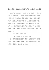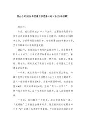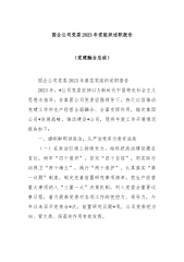 国企公司党总支关于落实2023年全面从严治党(党建)责任情况检查考核反馈意见的整改方案按照《XX公司2023年全面从严治党(党建)责任检查考核情况通报》和《关于XXXX有限公司直管企党组织落实全面从严治党(党建)责任情况检查考核反馈意见的通知》要求,为扎实做好2023年全面从严治党(党建)责任检查考核反馈意见的整改工作,XX公司党总支高度重视,逐条对照通知中指出的各种问题,举一反三,认真查找自身工作存在的问题,并及时进行整改,现结合实际,制定如下整改方案。一、目标任务坚持以习近平新时代中国特色社会主义思想为指导,围绕全面从严治党(党建)责任考核要求,坚持问题导向,聚焦集团党委反馈意见指出的问题...
