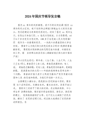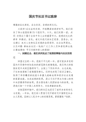 企业党委书记在2024年国庆节座谈会暨公司改革发展推进会上的讲话同志们:金秋十月,举国同庆。在这个收获的季节里,我们欢聚一堂,共叙友谊、共商发展大计。首先,我代表集团公司党委向各位干部职工致以节日的问候和美好的祝愿!刚才,我们共同观看了庆祝新中国成立75周年文艺演出,聆听了集团总经理、党委副书记王敏同志的重要讲话,回顾了集团公司改革发展的奋斗历程,展望了集团公司未来的发展愿景。集团各子公司、各部门负责同志分别作了交流发言,大家讲得都很好。会后,各单位要抓好会议精神的贯彻落实。下面,我就当前和今后一个时期工作再强调几点意见。一、清醒认识企业面临的形势和任务(一)企业发展面临的机遇。近年来,国家深...