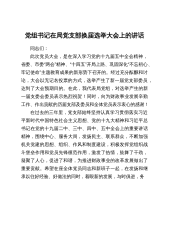本文系邮箱投稿,仅供学习参考,请勿照搬照抄!在X党总支换届选举大会上的讲话同志们:本次党员大会,是在全局上下深入贯彻党的十九大精神之际召开的。经过充分的酝酿和讨论,大会以无记名投票的方式,选举产生了新一届党总支委员,达到了大会预期的目的。在此,我代表县局党组,对选举产生的新一届总支委员表示热烈祝贺!同时,向为X事业发展辛勤工作、作出贡献的历届党总支及委员、各基层党支部和全体党员同志们表示诚挚的问候!在过去的三年里,县局党总支始终坚持全面落实习近平新时代中国特色社会主义思想,认真贯彻党的十八大、十九大精神,深入推进“两学一做”学习教育常态化制度化,围绕中心、服务大局,发扬民主、联系群众,不断加强...