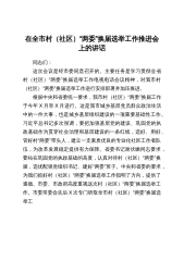 在全市村(社区)“两委”换届选举工作推进会上的讲话同志们:这次会议是经市委同意召开的。主要任务是学习贯彻全省村(社区)“两委”换届选举工作电视电话会议精神,对我市村(社区)“两委”换届选举工作进行安排部署并加压推进。根据中央和省委统一要求,我市村(社区)“两委”换届工作于今年X月至X月进行。这是我市城乡基层党员群众政治生活中的一件大事,也是城乡基层组织建设的一项重要基础性工作。习近平总书记多次强调,要把加强基层党的建设、巩固党的执政基础作为贯穿社会治理和基层建设的一条红线,选好、用好、管好村“两委”带头人,建立一支素质优良的专业化社区工作者队伍,为改革发展稳定提供有力保障。省委书记谢伏瞻同志要...