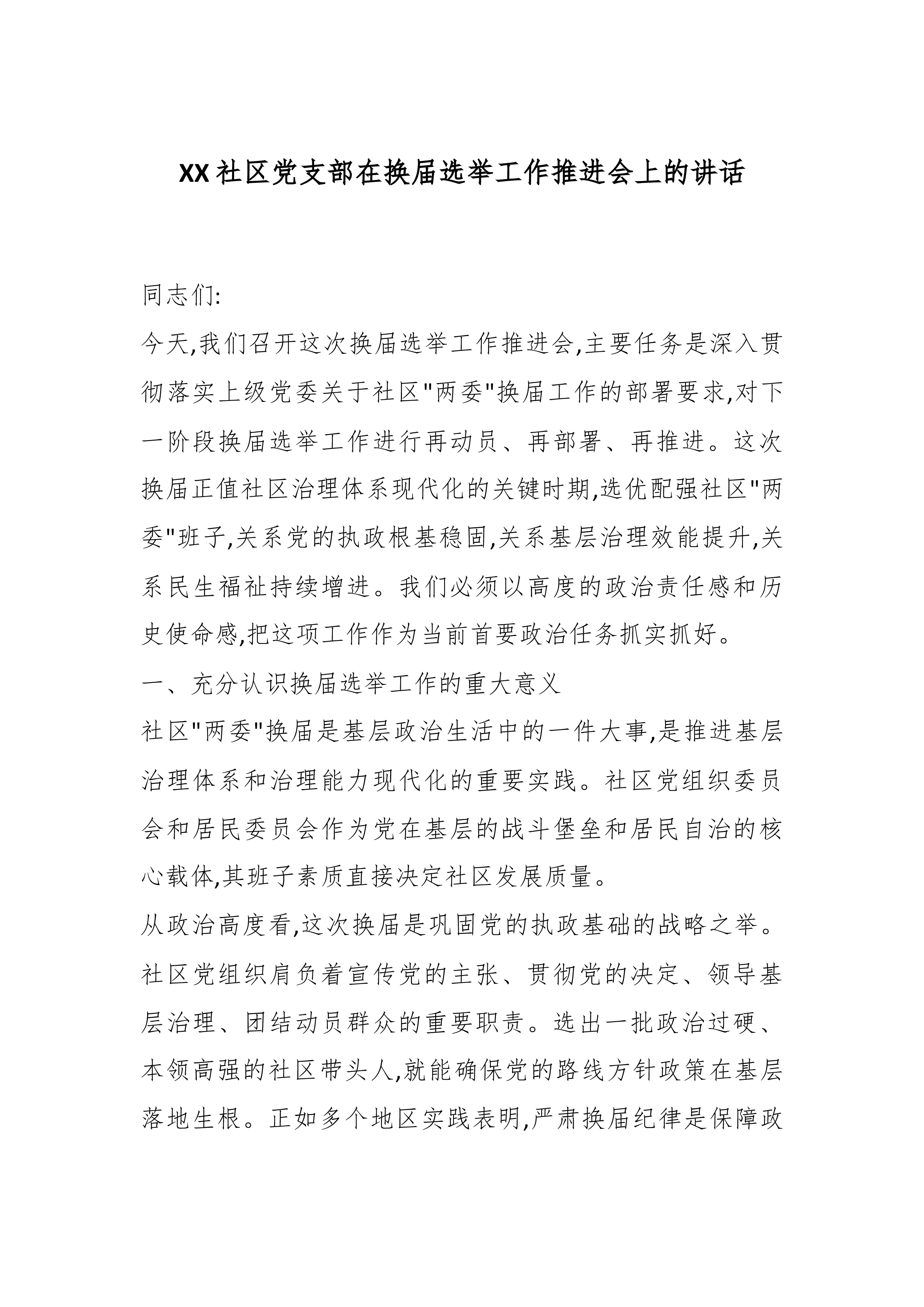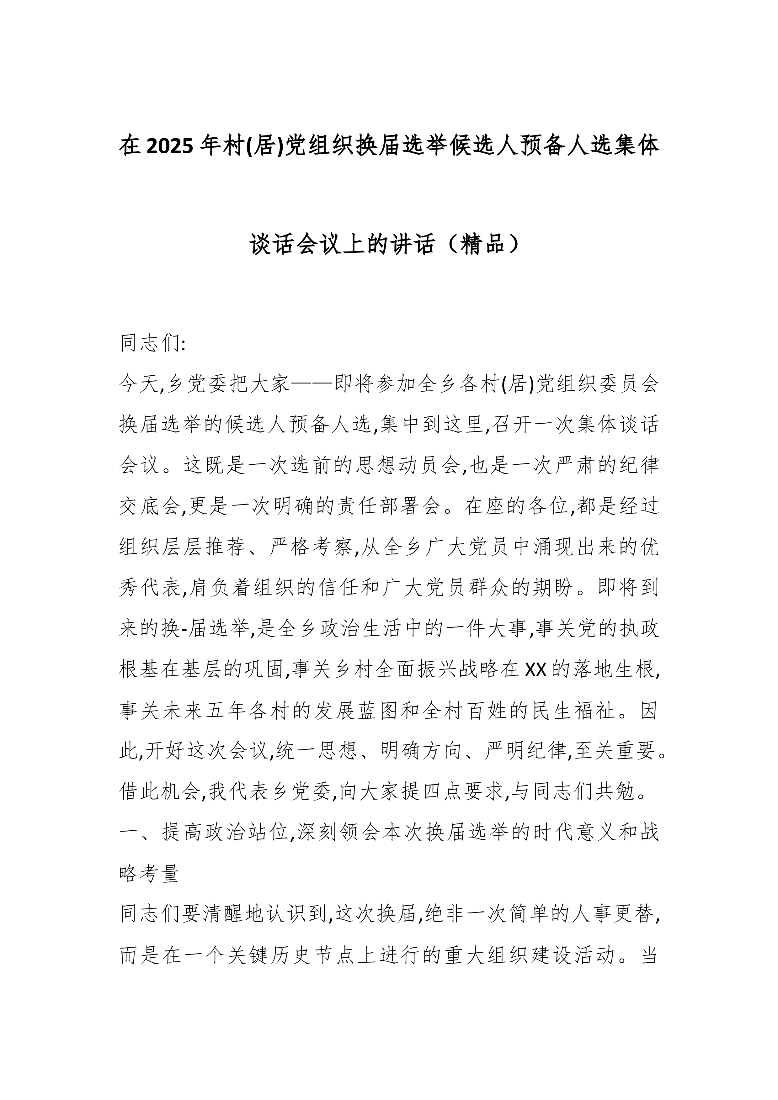 在2025年村(居)党组织换届选举候选人预备人选集体谈话会议上的讲话(精品)同志们:今天,乡党委把大家——即将参加全乡各村(居)党组织委员会换届选举的候选人预备人选,集中到这里,召开一次集体谈话会议。这既是一次选前的思想动员会,也是一次严肃的纪律交底会,更是一次明确的责任部署会。在座的各位,都是经过组织层层推荐、严格考察,从全乡广大党员中涌现出来的优秀代表,肩负着组织的信任和广大党员群众的期盼。即将到来的换-届选举,是全乡政治生活中的一件大事,事关党的执政根基在基层的巩固,事关乡村全面振兴战略在XX的落地生根,事关未来五年各村的发展蓝图和全村百姓的民生福祉。因此,开好这次会议,统一思想、明确方向、严明纪律,至关重要。借此机会,我代表乡党委,向大家提四点要求,与同志们共勉。一、提高政治站位,深...