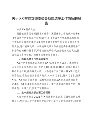 关于XX村党支部委员会换届选举工作情况的报告中共XX镇委员会:根据镇党委关于村(社区)“两委”换届选举工作的统一部署和《中国共产党支部工作条例(试行)》《中国共产党农村基层组织工作条例》等有关规定,XX村党支部于2025年X月X日召开党员大会,进行换届选举。本次换届选举工作在镇党委和换届选举工作指导组的精心指导下,严格按照选举程序,充分发扬党内民主,圆满完成了各项议程。现将有关情况报告如下。一、换届选举工作的基本情况XX村党支部现有正式党员XX名,预备党员X名。本次党员大会应到会有选举权的正式党员XX名,实到XX名,超过应到会人数的五分之四,符合规定人数。大会选举产生了新一届XX村党支部委员会,委员会由X名委员组成,其中书记1名,副书记1名,委员X名。XX同志当选为新一届村党支部书记,XX同...