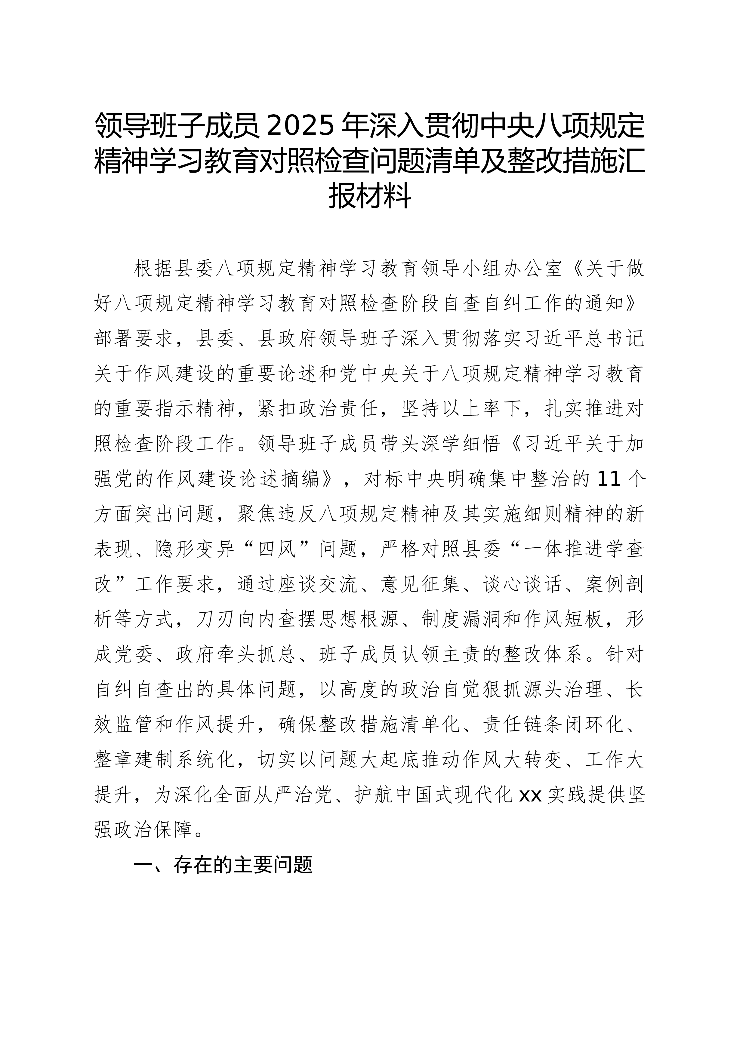领导班子成员2025年深入贯彻中央八项规定精神学习教育对照检查问题清单及整改措施汇报材料根据县委八项规定精神学习教育领导小组办公室《关于做好八项规定精神学习教育对照检查阶段自查自纠工作的通知》部署要求,县委、县政府领导班子深入贯彻落实习近平总书记关于作风建设的重要论述和党中央关于八项规定精神学习教育的重要指示精神,紧扣政治责任,坚持以上率下,扎实推进对照检查阶段工作。领导班子成员带头深学细悟《习近平关于加强党的作风建设论述摘编》,对标中央明确集中整治的11个方面突出问题,聚焦违反八项规定精神及其实施细则精神的新表现、隐形变异“四风”问题,严格对照县委“一体推进学查改”工作要求,通过座谈交流、意见征集、谈心谈话、案例剖析等方式,刀刃向内查摆思想根源、制度漏洞和作风短板,形成党委、政府牵头抓总、...