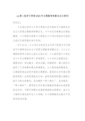 第二批学习贯彻习近平新时代中国特色社会主义思想主题教育领导小组第一次会议主持词同志们:按照党中央和X委统一部署,X第二批学习贯彻习近平新时代中国特色社会主义思想主题教育正式全面启动。第二批主题教育在基层开展,意义重大、责任重大。我局也相继召开了主题教育筹备会、主题教育动员部署会,为前期各项准备工作、思想动员工作做了充分准备。今天召集第二批主题教育领导小组成员召开第一次会议,主要目的是,听取X主题教育近期工作情况,审议领导小组有关制度文件,为X主题教育扎实开展夯实基础,持续推动主题教育走深走实、见行见效。w参见今天会议的有,第二批主题教育领导小组全体成员、区委组织部X同志、区纪委监委第X纪检监察...