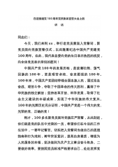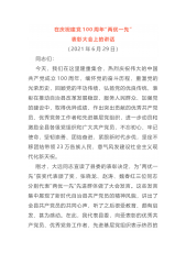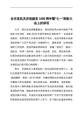 在市直机关庆祝建党100周年暨“七一”表彰大会上的讲话今天,我们在这里隆重集会,热烈庆祝伟大的中国共产党诞辰100周年,表彰2020年度市直机关“四好班子”、先进基层党组织、优秀党务工作者和优秀共产党员,动员市直机关各级党组织和广大共产党员进一步围绕中心、服务发展,以更加饱满的工作热情、更加昂扬的精神状态,创建一流班子、建设一流队伍、培养一流作风、创造一流业绩。在此,我代表市委,向受到表彰的先进集体和优秀个人表示热烈的祝贺!向市直机关全体党员致以节日的慰问!向奋战在机关党建工作第一线的全体同志们表示衷心的感谢!刚才,市直机关工委表彰的一批先进组织和优秀个人,他们正是我市市直机关各级党组织和广大...