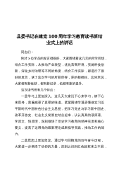 县委书记在建党100周年学习教育读书班结业式上的讲话同志们:刚才x位学员的发言都很好,大家围绕着这几天的所学所想,结合工作实际,从推动产业转型,优化营商环境,实施科技创新,深化乡村治理等不同的角度,结合工作实际,都进行了很好的发言,谈了这次学习的所获所得,讲的都很好。总体来说,大家都有新收获,都有新记录,也都有新的提升。这次读书班有几个特点:一是学习上更加深入。这几天大家沉下心来学习,静下心来思考,普遍感受了真理的味道。紧紧围绕学通弄懂做实习近平新时代中国特色社会主义思想,把学习党史与学习新中国史、改革开放史、社会主义发展史结合起来,认认真真的读原著、学原文、悟原理,深刻领悟了党史学习教育的精...
