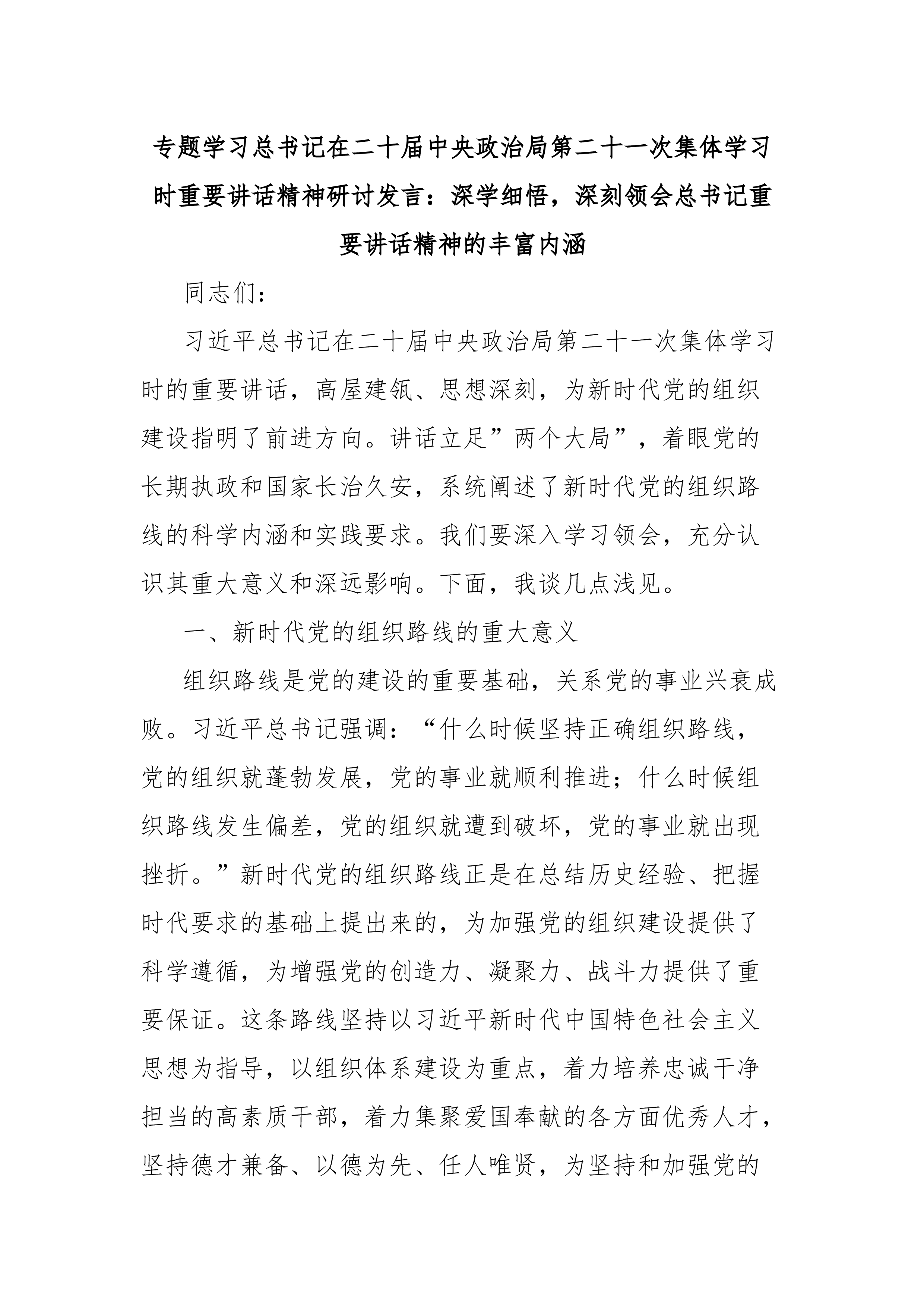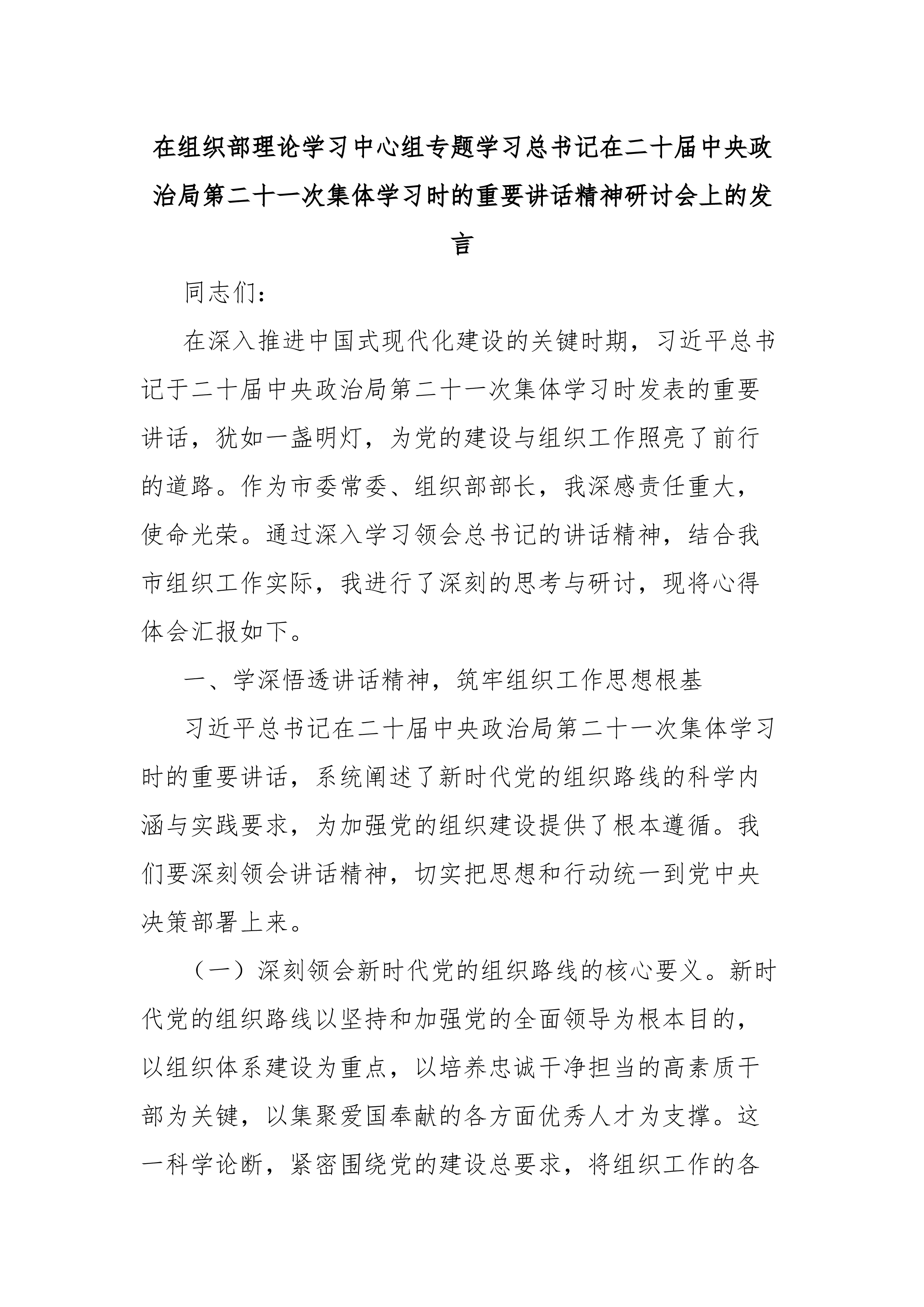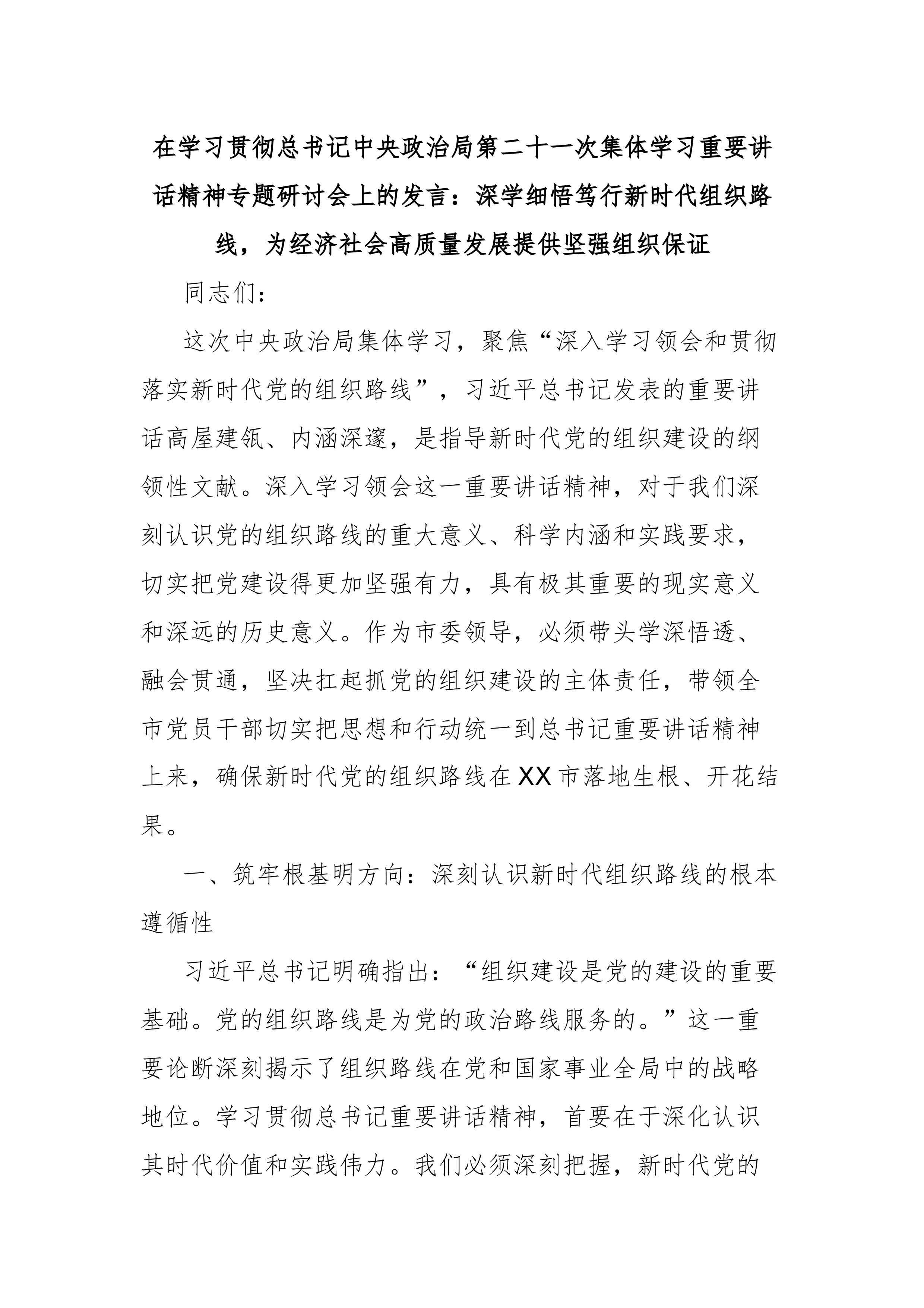 在学习贯彻总书记中央政治局第二十一次集体学习重要讲话精神专题研讨会上的发言:深学细悟笃行新时代组织路线,为经济社会高质量发展提供坚强组织保证同志们:这次中央政治局集体学习,聚焦“深入学习领会和贯彻落实新时代党的组织路线”,习近平总书记发表的重要讲话高屋建瓴、内涵深邃,是指导新时代党的组织建设的纲领性文献。深入学习领会这一重要讲话精神,对于我们深刻认识党的组织路线的重大意义、科学内涵和实践要求,切实把党建设得更加坚强有力,具有极其重要的现实意义和深远的历史意义。作为市委领导,必须带头学深悟透、融会贯通,坚决扛起抓党的组织建设的主体责任,带领全市党员干部切实把思想和行动统一到总书记重要讲话精神上来,确保新时代党的组织路线在XX市落地生根、开花结果。一、筑牢根基明方向:深刻认识新时代组织路线的根本...