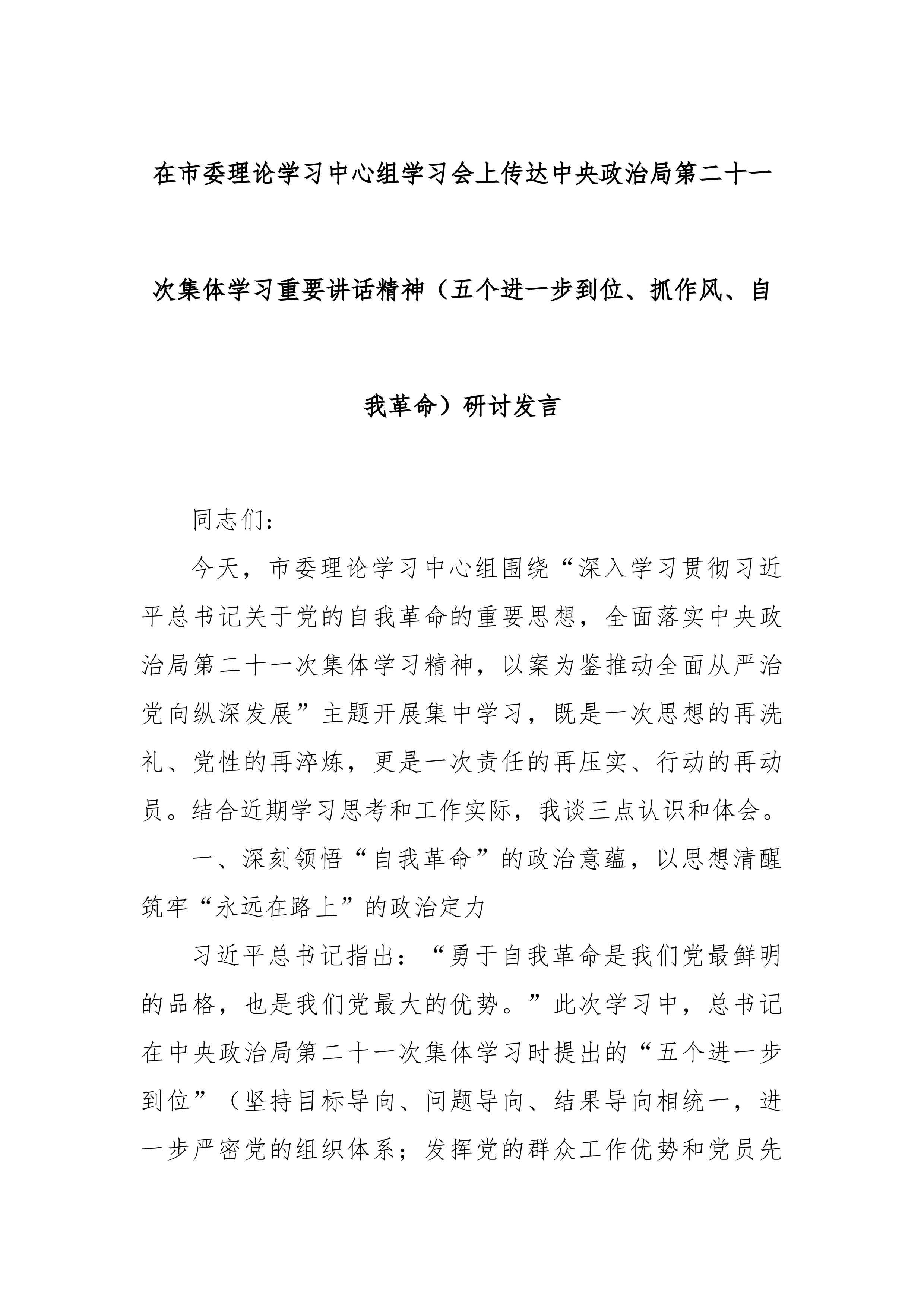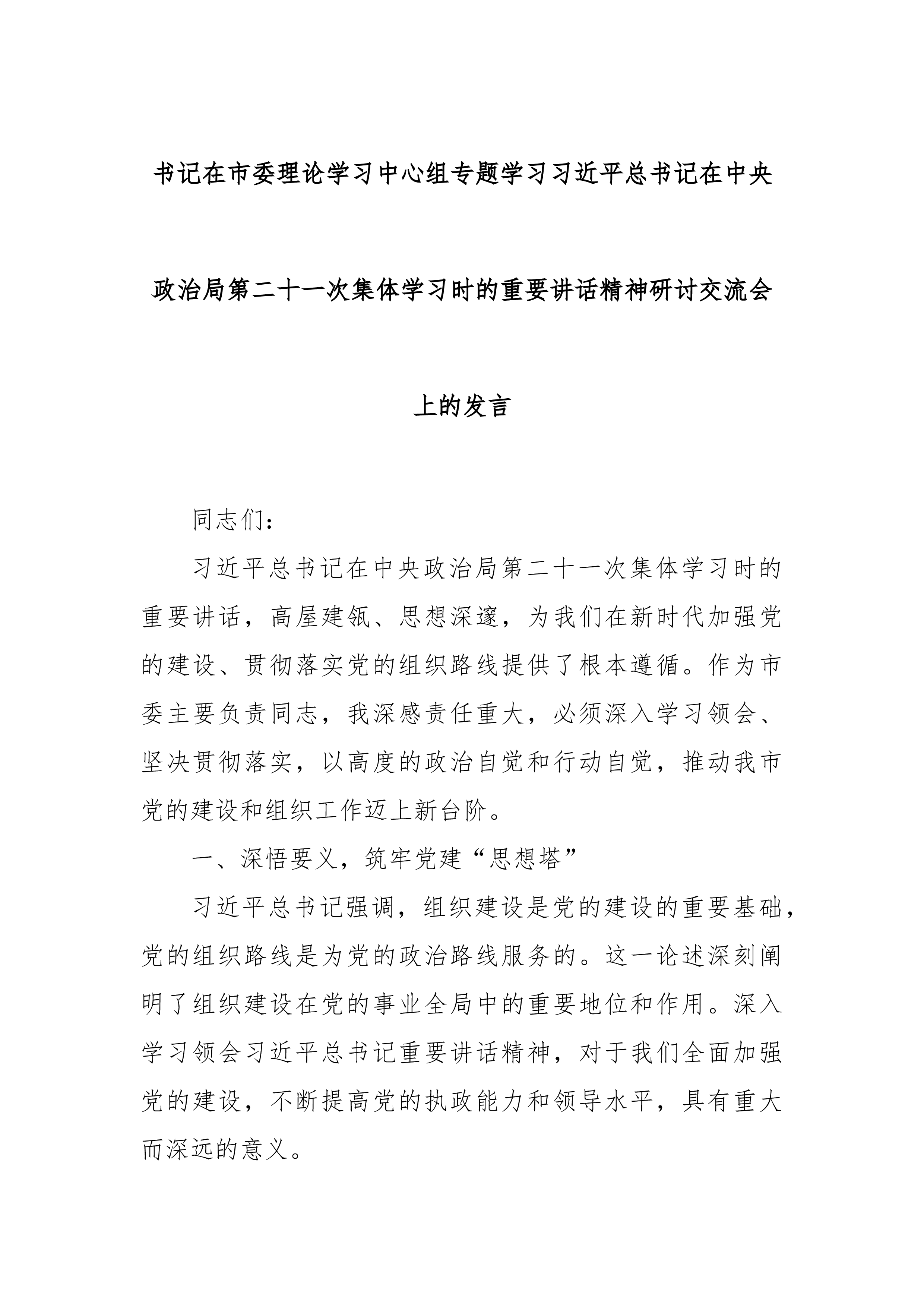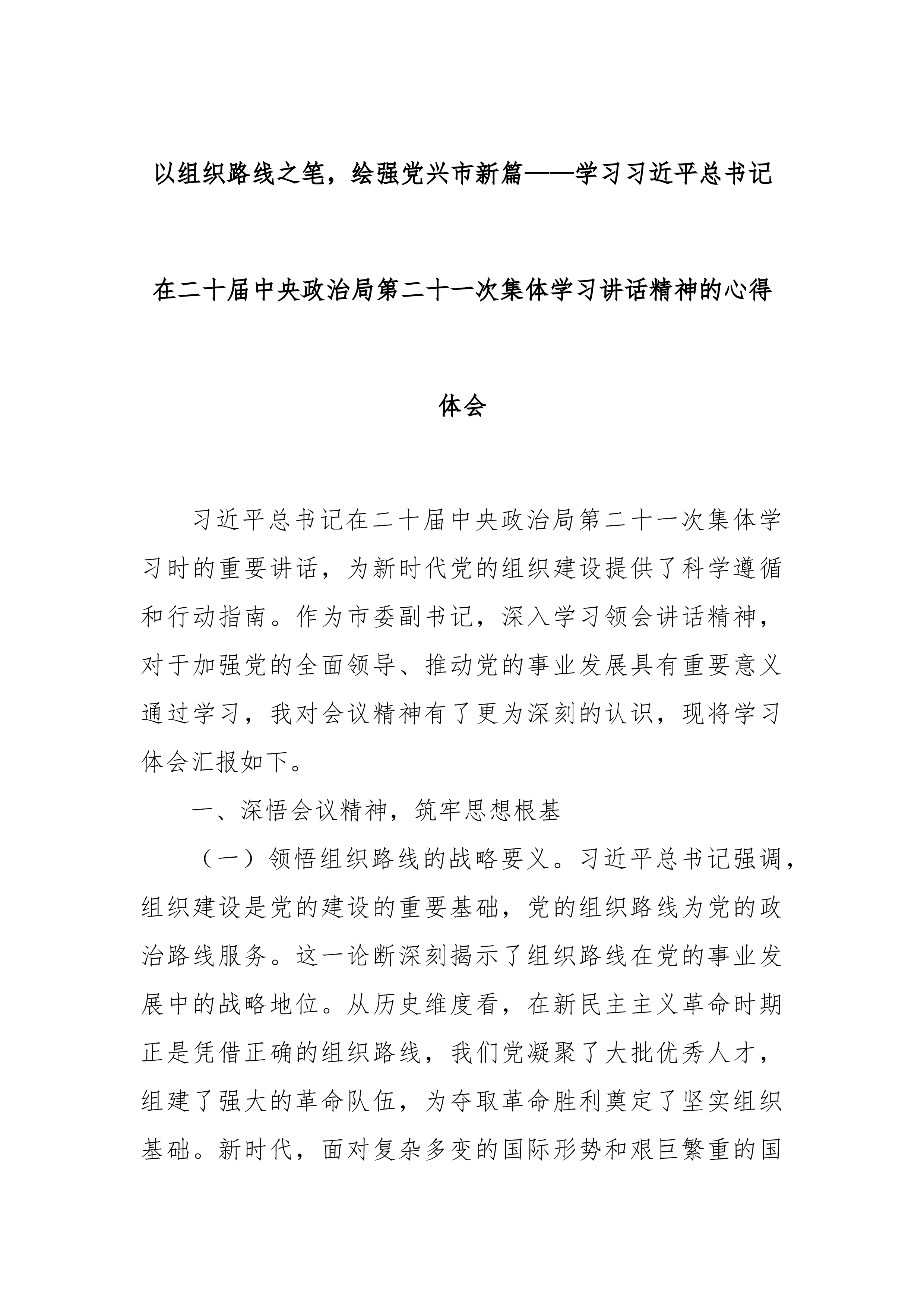在学习贯彻总书记中央政治局第二十一次集体学习重要讲话精神专题研讨会上的发言:深学细悟笃行新时代组织路线,为经济社会高质量发展提供坚强组织保证同志们:这次中央政治局集体学习,聚焦“深入学习领会和贯彻落实新时代党的组织路线”,习近平总书记发表的重要讲话高屋建瓴、内涵深邃,是指导新时代党的组织建设的纲领性文献。深入学习领会这一重要讲话精神,对于我们深刻认识党的组织路线的重大意义、科学内涵和实践要求,切实把党建设得更加坚强有力,具有极其重要的现实意义和深远的历史意义。作为市委领导,必须带头学深悟透、融会贯通,坚决扛起抓党的组织建设的主体责任,带领全市党员干部切实把思想和行动统一到总书记重要讲话精神上来,确保新时代党的组织路线在XX市落地生根、开花结果。一、筑牢根基明方向:深刻认识新时代组织路线的根本...