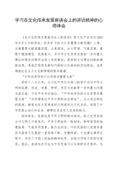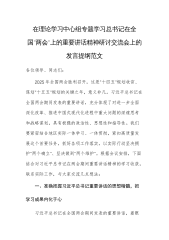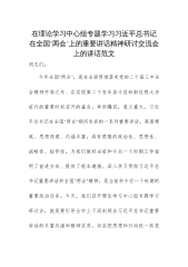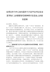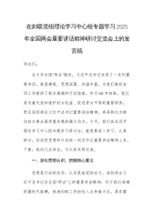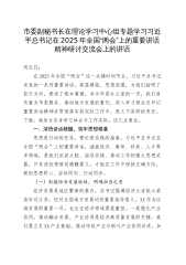 市委副秘书长在理论学习中心组专题学习习近平总书记在2025年全国“两会”上的重要讲话精神研讨交流会上的讲话同志们:在2025年全国“两会”这一关键时间节点,习近平总书记发表的一系列重要讲话,高屋建瓴、思想深邃,为我们指明了前行方向,提供了根本遵循。身为市委办公室的一员,我们肩负着为市委服务、推动地方发展的重任,深入学习领会总书记重要讲话精神并贯彻落实到实际工作中,是义不容辞的责任。下面,我结合自身学习体会与工作实际,谈几点看法。一、深悟讲话精髓,筑牢思想根基思想是行动的先导,理论是实践的指南。习近平总书记在全国“两会”上的重要讲话,涵盖经济、教育、科技、人才等多领域,是我们武装头脑、指导实践、...