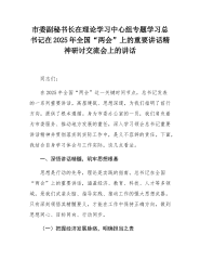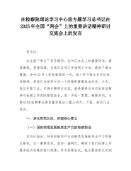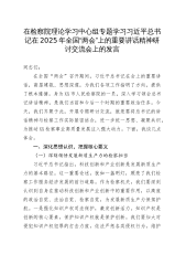 在检察院理论学习中心组专题学习习近平总书记在2025年全国“两会”上的重要讲话精神研讨交流会上的发言同志们:在全国“两会”召开期间,习近平总书记在会上的重要讲话,高屋建瓴、思想深邃,为我们各项工作指明了方向,提供了根本遵循。身为XX市人民检察院的一员,深入学习领会总书记讲话精神,是我们当前和今后一个时期的重要政治任务。今天,我们齐聚于此,开展专题研讨交流,就是要将总书记的讲话精神与检察工作实际紧密结合,进一步统一思想、凝聚共识,为推动XX检察事业高质量发展注入强大动力。下面,我谈几点体会。一、深化思想认识,把握核心要义(一)深刻领悟发展新质生产力的检察担当习近平总书记指出,科技创新和产业创新是...