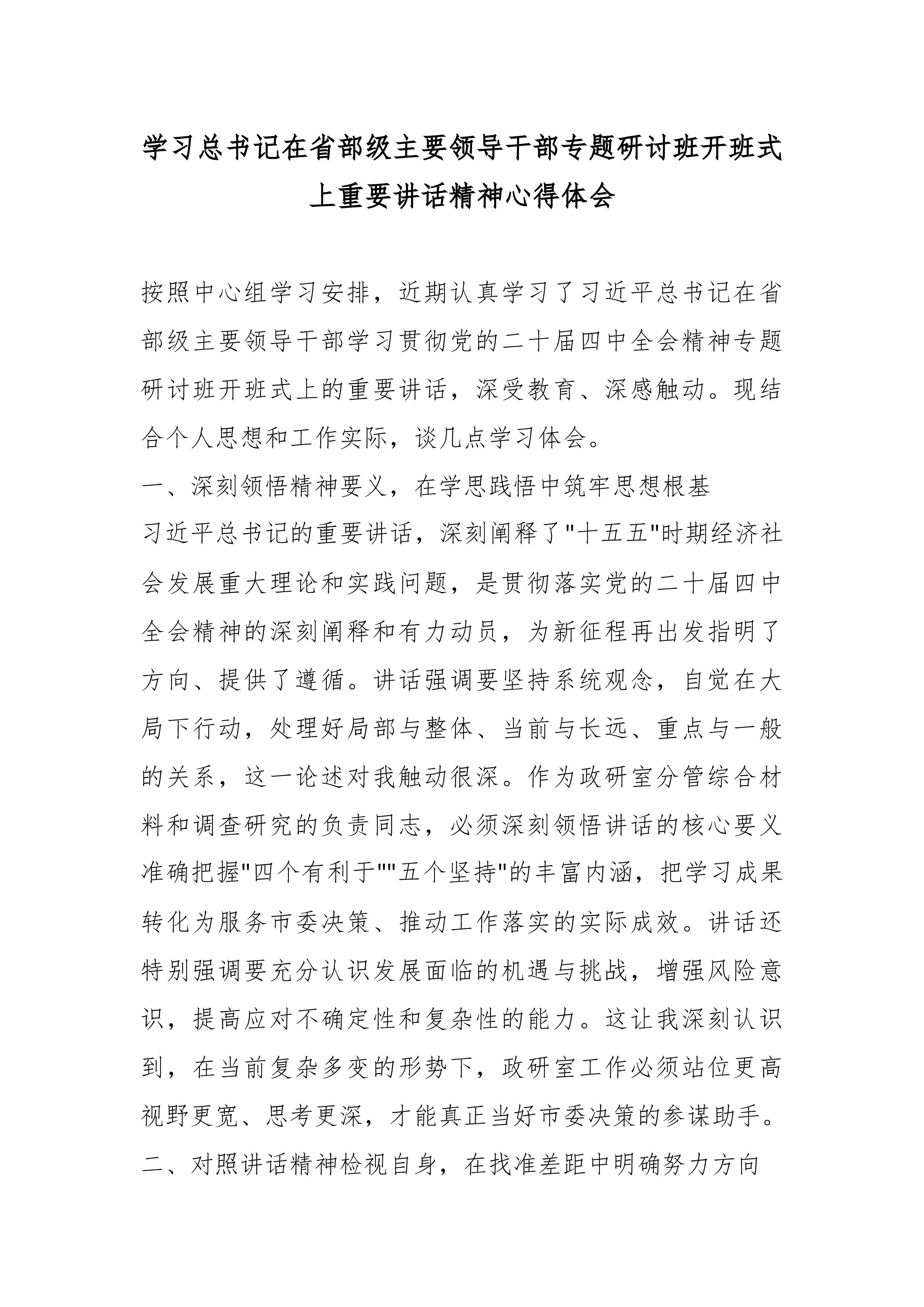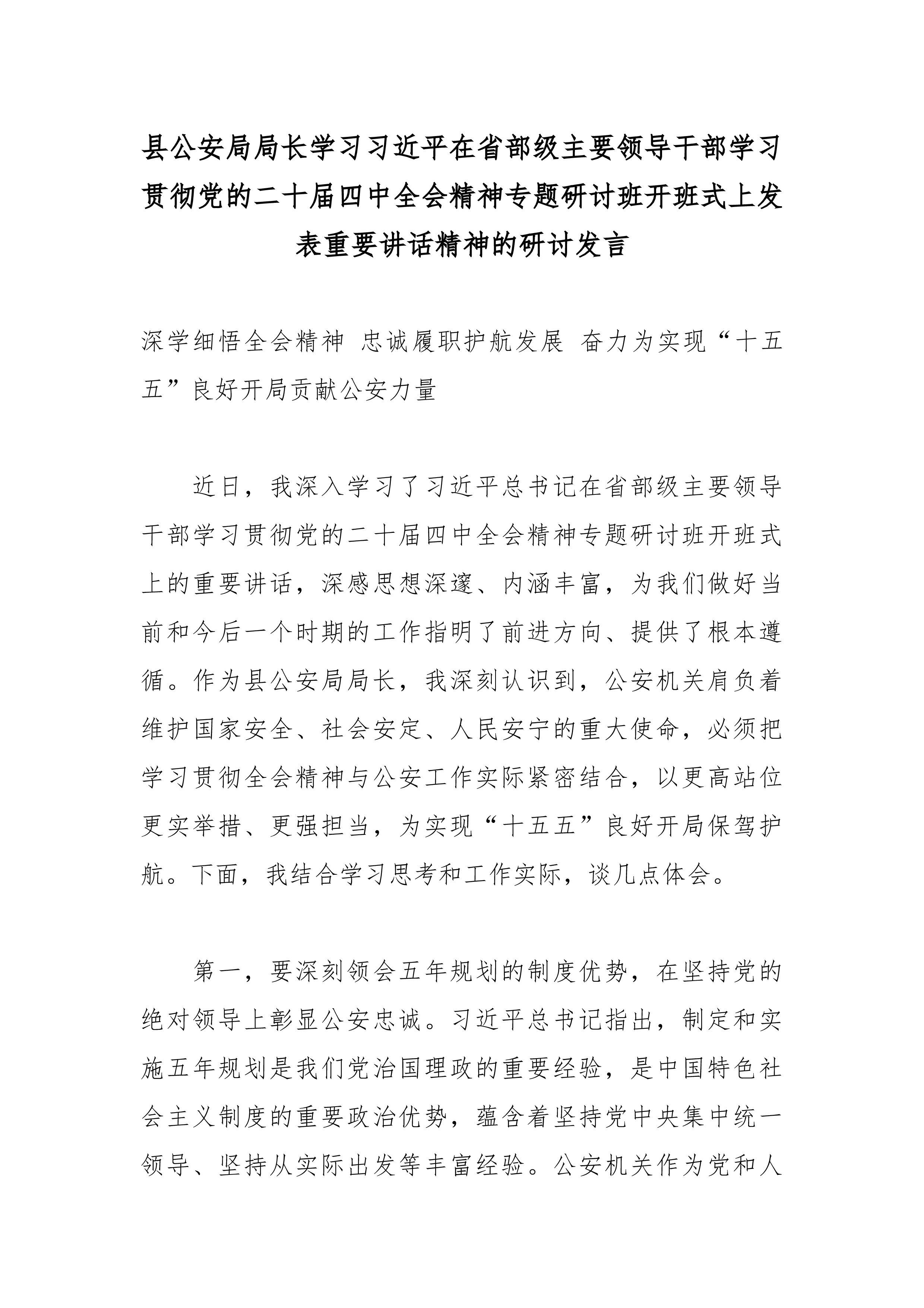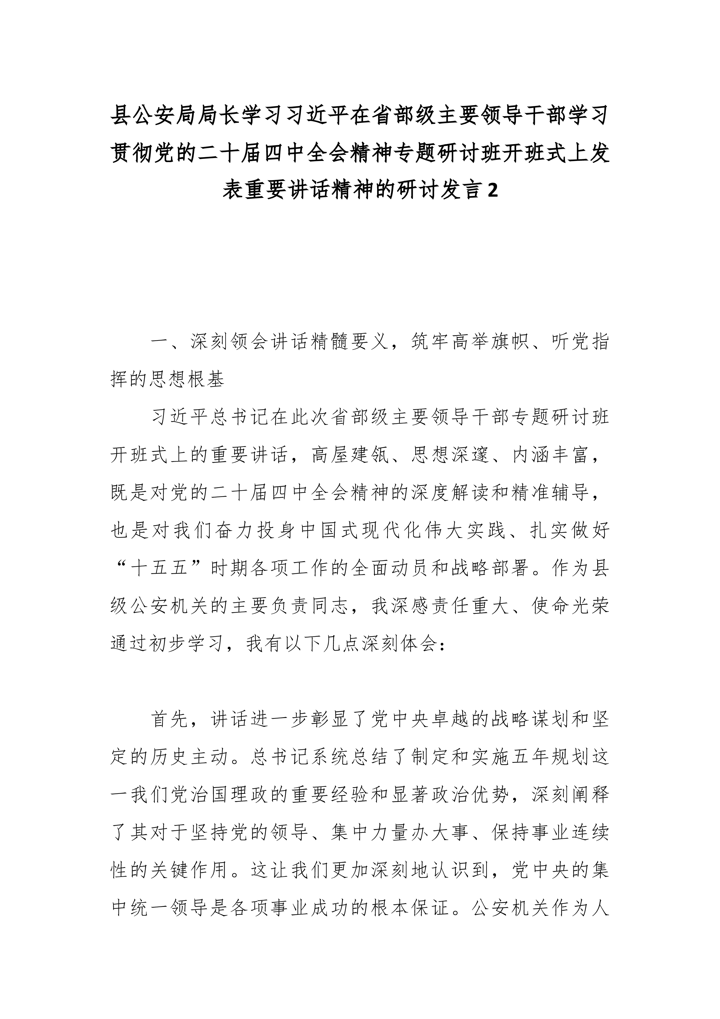 县公安局局长学习习近平在省部级主要领导干部学习贯彻党的二十届四中全会精神专题研讨班开班式上发表重要讲话精神的研讨发言2 一、深刻领会讲话精髓要义,筑牢高举旗帜、听党指挥的思想根基 习近平总书记在此次省部级主要领导干部专题研讨班开班式上的重要讲话,高屋建瓴、思想深邃、内涵丰富,既是对党的二十届四中全会精神的深度解读和精准辅导,也是对我们奋力投身中国式现代化伟大实践、扎实做好“十五五”时期各项工作的全面动员和战略部署。作为县级公安机关的主要负责同志,我深感责任重大、使命光荣通过初步学习,我有以下几点深刻体会: 首先,讲话进一步彰显了党中央卓越的战略谋划和坚定的历史主动。总书记系统总结了制定和实施五年规划这一我们党治国理政的重要经验和显著政治优势,深刻阐释了其对于坚持党的领导、集中力量办大事...