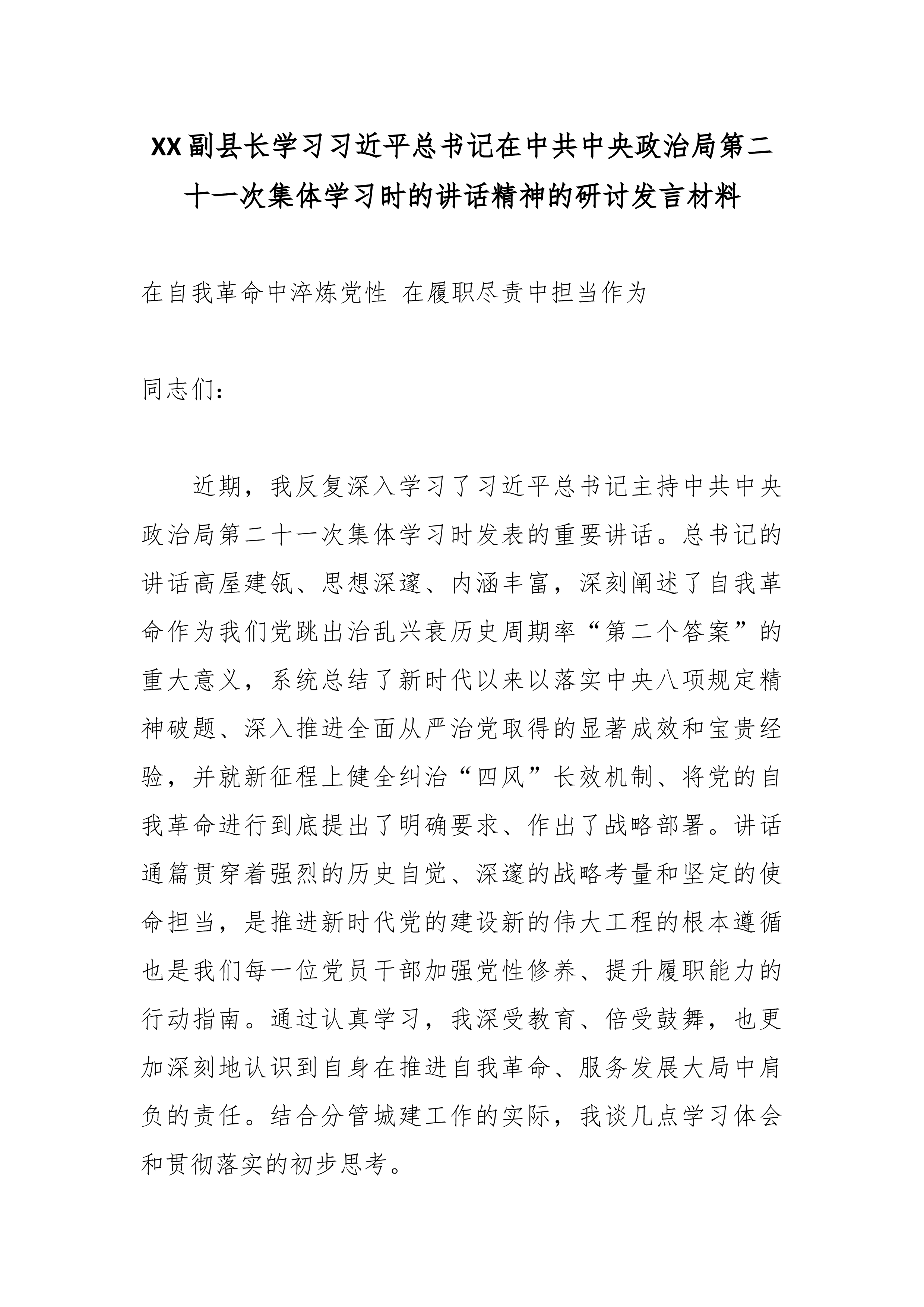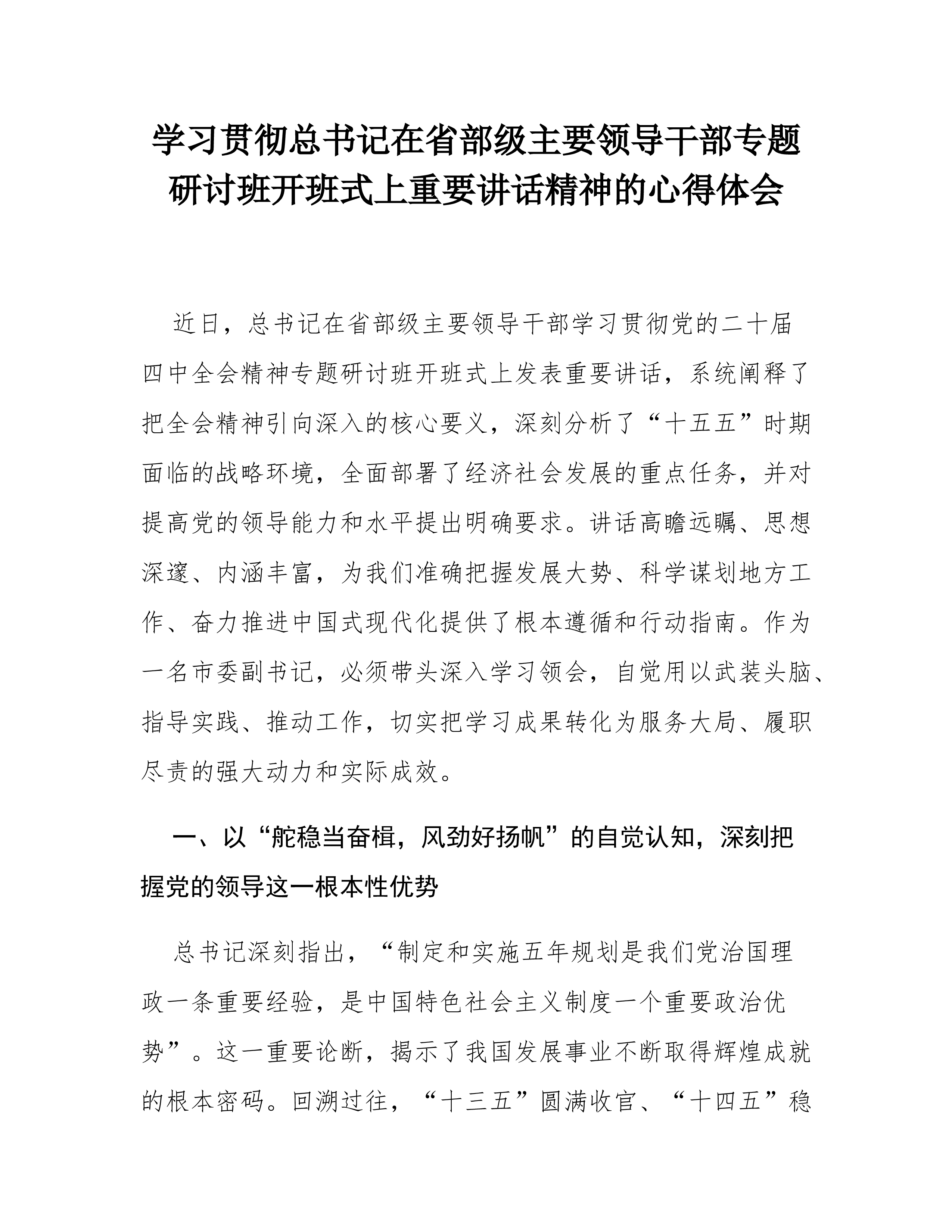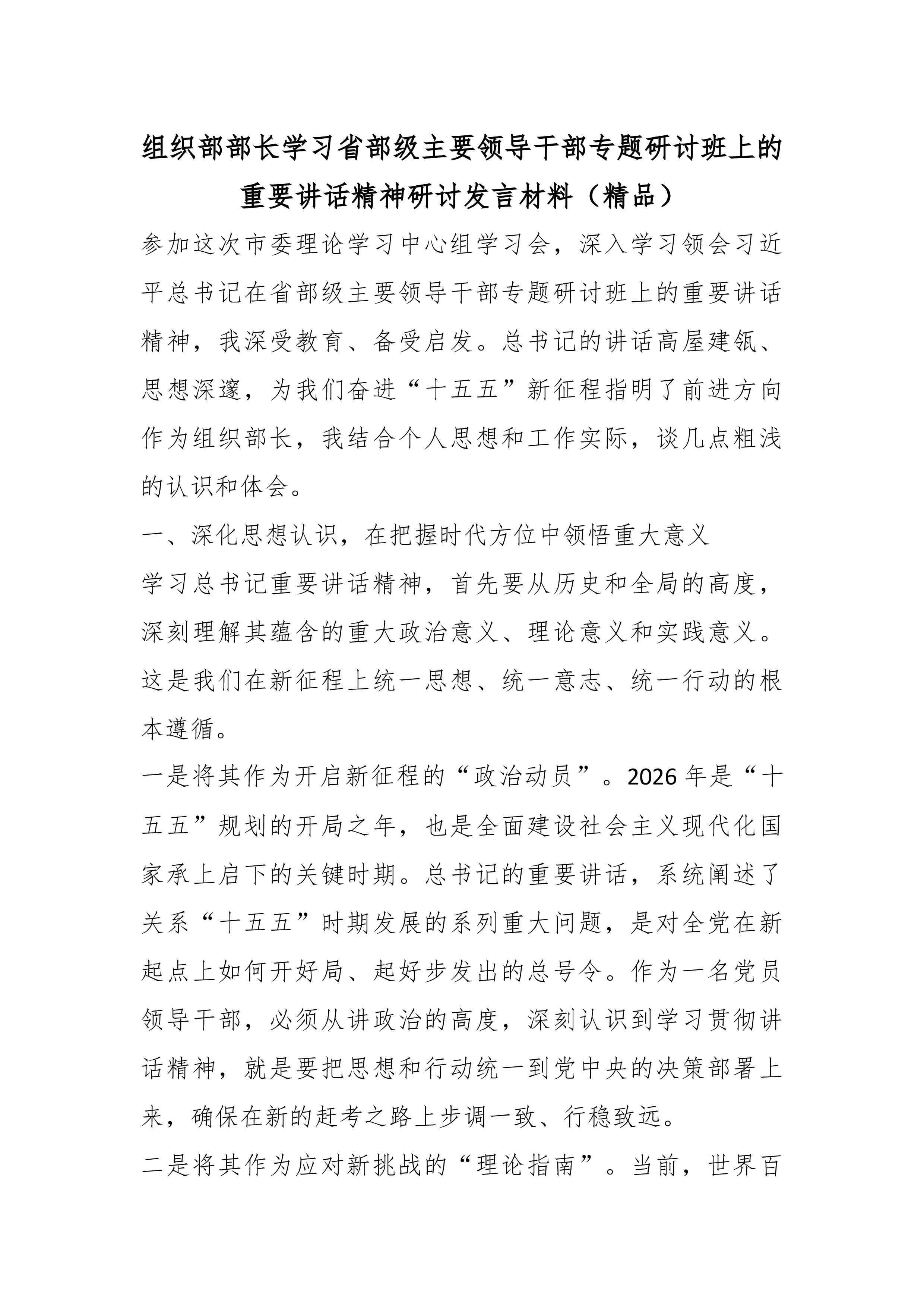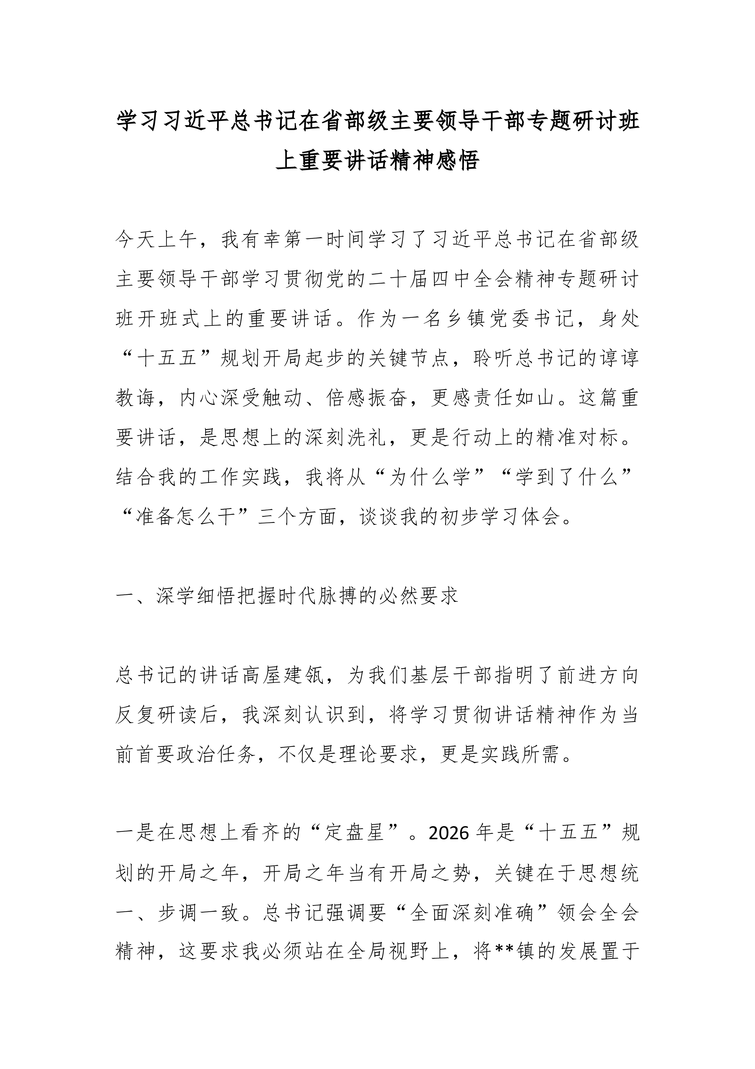 县公安局局长学习习近平在省部级主要领导干部学习贯彻党的二十届四中全会精神专题研讨班开班式上发表重要讲话精神的研讨发言2 一、深刻领会讲话精髓要义,筑牢高举旗帜、听党指挥的思想根基 习近平总书记在此次省部级主要领导干部专题研讨班开班式上的重要讲话,高屋建瓴、思想深邃、内涵丰富,既是对党的二十届四中全会精神的深度解读和精准辅导,也是对我们奋力投身中国式现代化伟大实践、扎实做好“十五五”时期各项工作的全面动员和战略部署。作为县级公安机关的主要负责同志,我深感责任重大、使命光荣通过初步学习,我有以下几点深刻体会: 首先,讲话进一步彰显了党中央卓越的战略谋划和坚定的历史主动。总书记系统总结了制定和实施五年规划这一我们党治国理政的重要经验和显著政治优势,深刻阐释了其对于坚持党的领导、集中力量办大事...