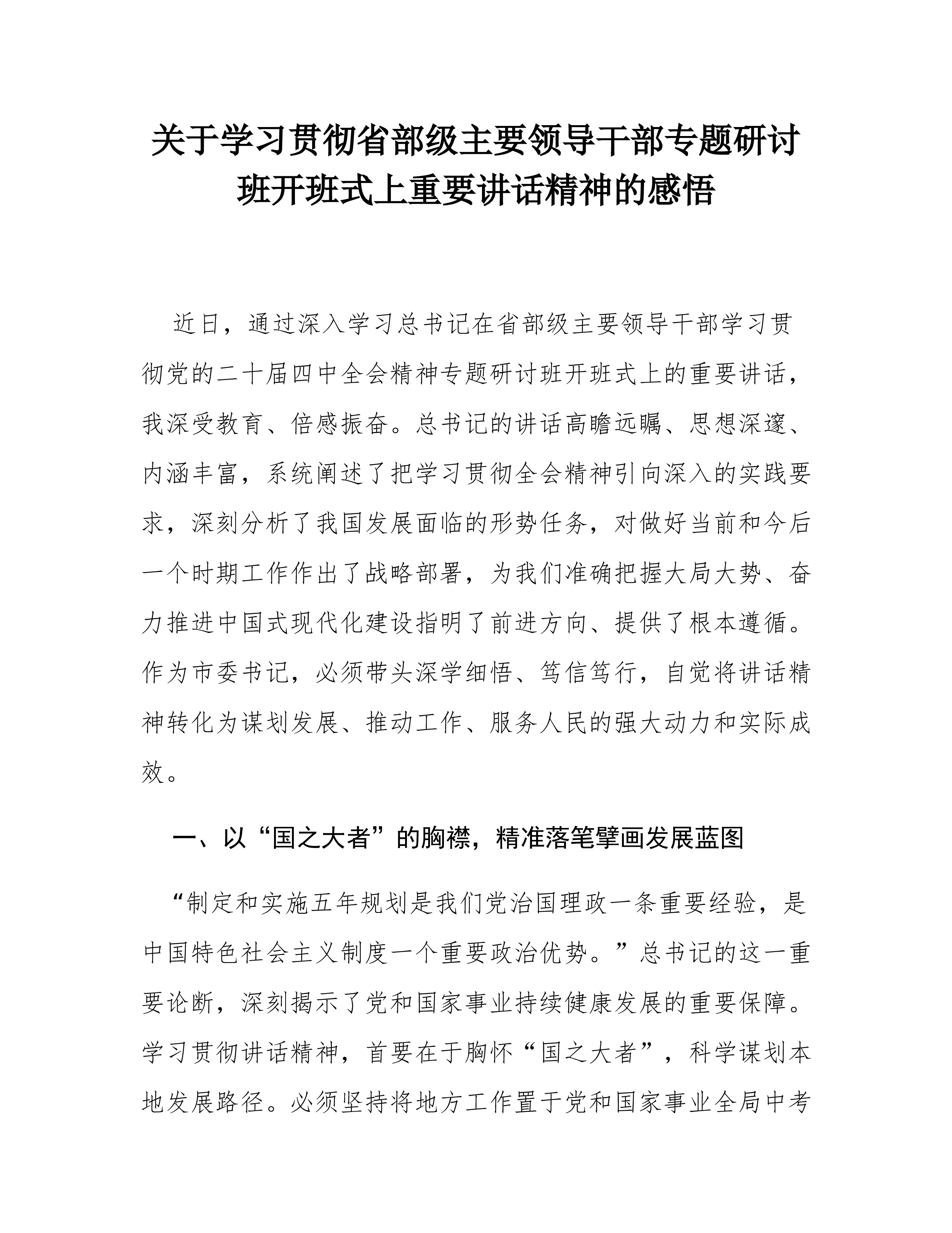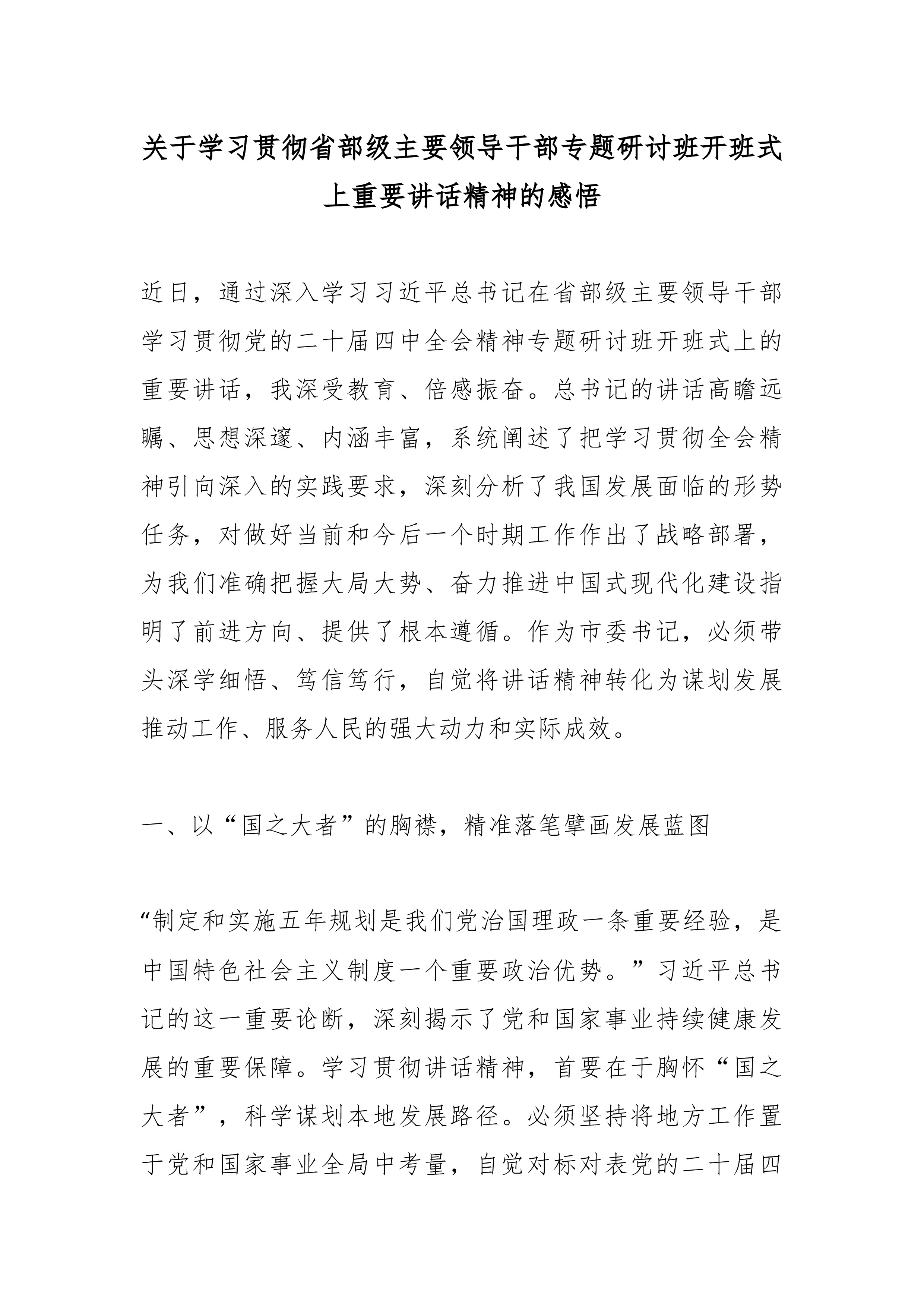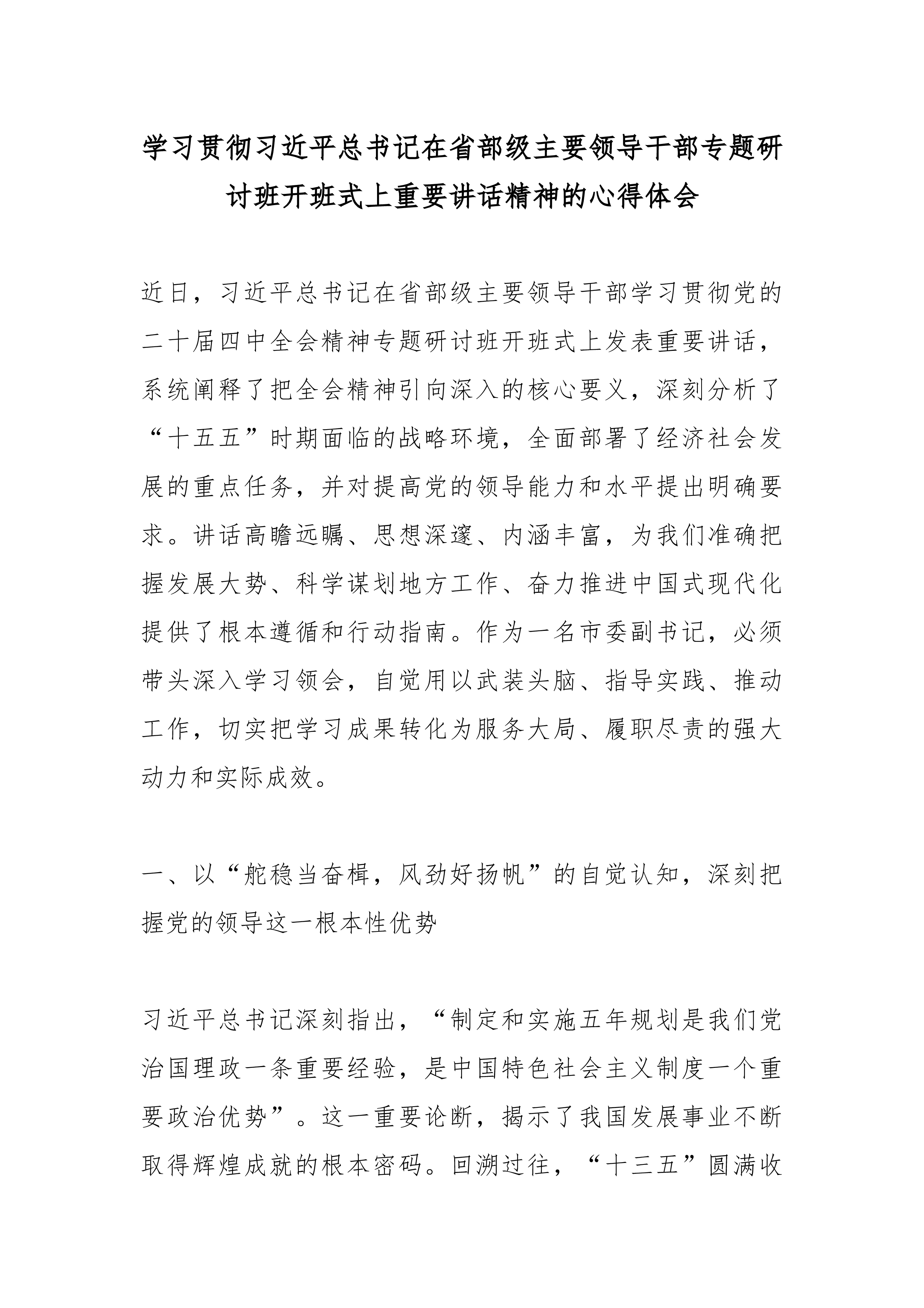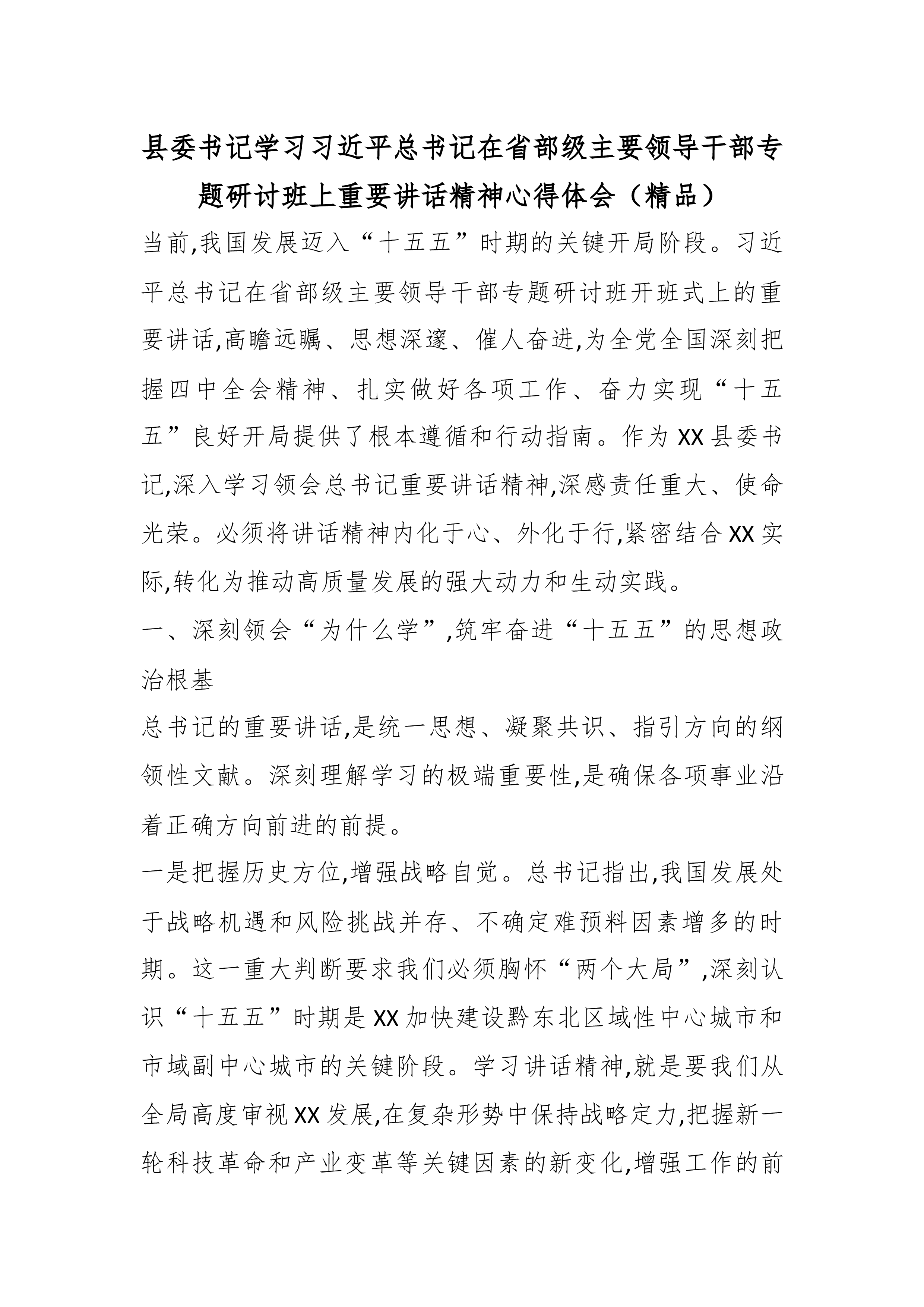 县委书记学习习近平总书记在省部级主要领导干部专题研讨班上重要讲话精神心得体会(精品)当前,我国发展迈入“十五五”时期的关键开局阶段。习近平总书记在省部级主要领导干部专题研讨班开班式上的重要讲话,高瞻远瞩、思想深邃、催人奋进,为全党全国深刻把握四中全会精神、扎实做好各项工作、奋力实现“十五五”良好开局提供了根本遵循和行动指南。作为XX县委书记,深入学习领会总书记重要讲话精神,深感责任重大、使命光荣。必须将讲话精神内化于心、外化于行,紧密结合XX实际,转化为推动高质量发展的强大动力和生动实践。一、深刻领会“为什么学”,筑牢奋进“十五五”的思想政治根基总书记的重要讲话,是统一思想、凝聚共识、指引方向的纲领性文献。深刻理解学习的极端重要性,是确保各项事业沿着正确方向前进的前提。一是把握历史方位,增强...