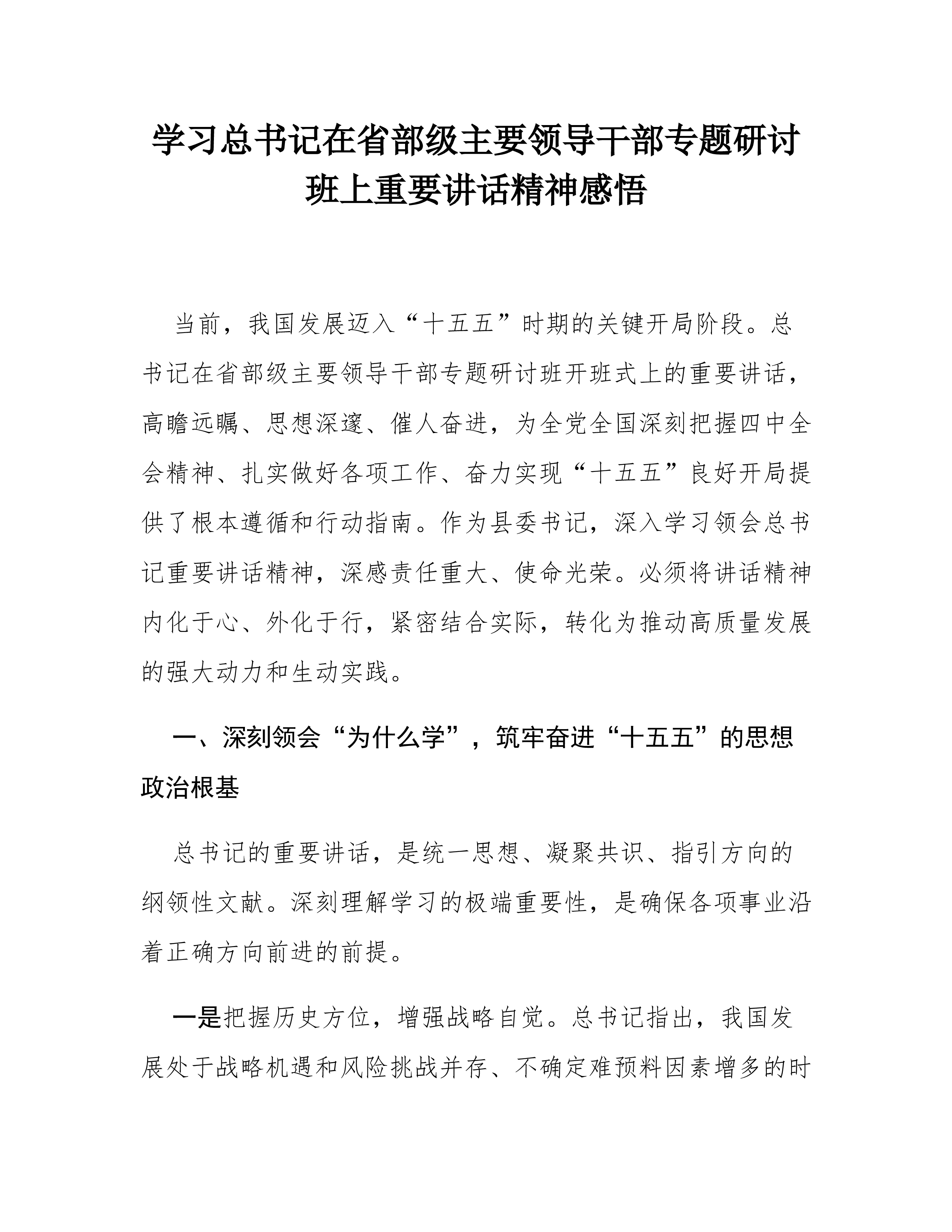 县委书记学习总书记在省部级主要领导干部专题研讨班上重要讲话精神心得体会(精品)