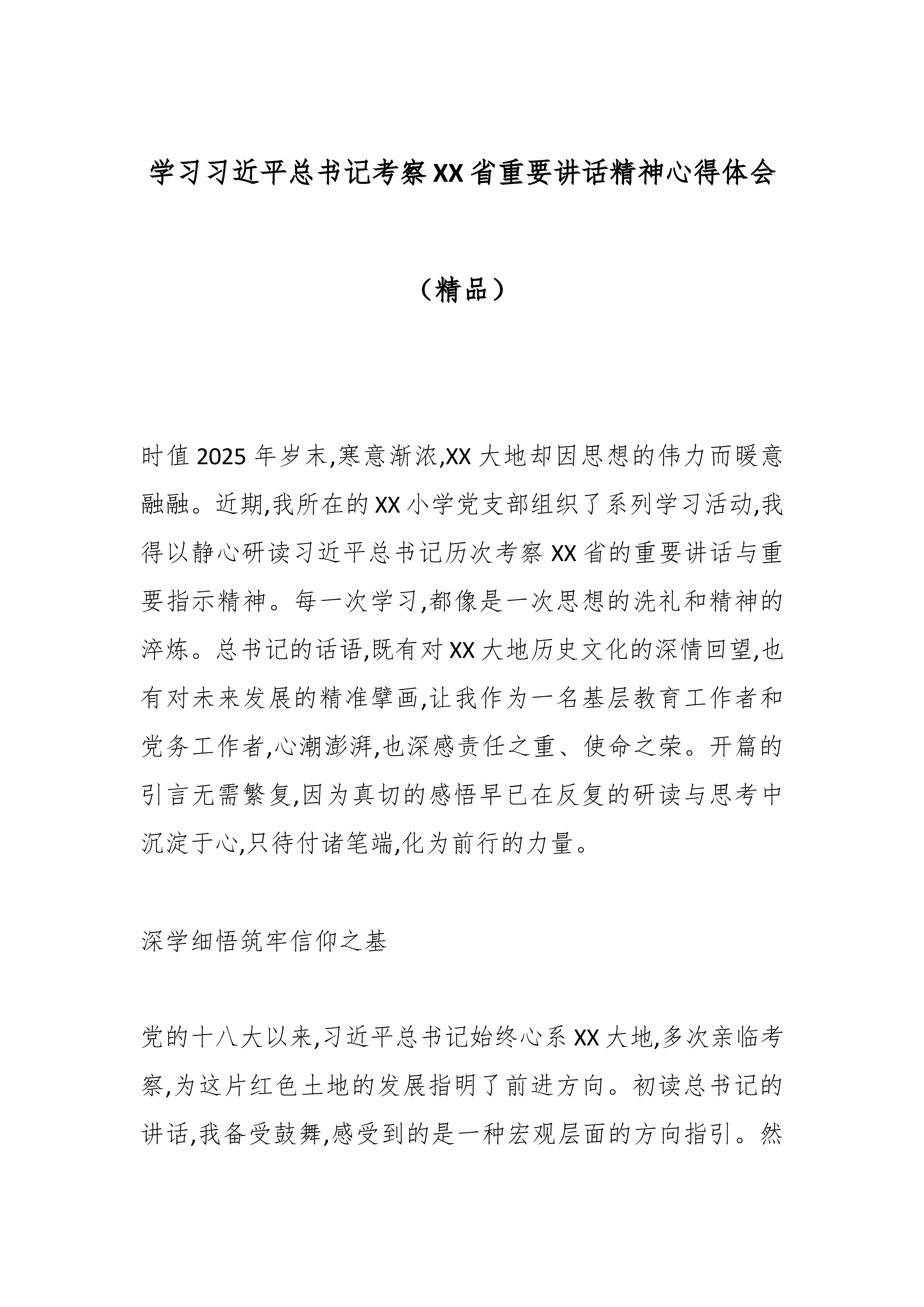 学习习近平总书记考察XX省重要讲话精神心得体会(精品)时值2025年岁末,寒意渐浓,XX大地却因思想的伟力而暖意融融。近期,我所在的XX小学党支部组织了系列学习活动,我得以静心研读习近平总书记历次考察XX省的重要讲话与重要指示精神。每一次学习,都像是一次思想的洗礼和精神的淬炼。总书记的话语,既有对XX大地历史文化的深情回望,也有对未来发展的精准擘画,让我作为一名基层教育工作者和党务工作者,心潮澎湃,也深感责任之重、使命之荣。开篇的引言无需繁复,因为真切的感悟早已在反复的研读与思考中沉淀于心,只待付诸笔端,化为前行的力量。深学细悟筑牢信仰之基党的十八大以来,习近平总书记始终心系XX大地,多次亲临考察,为这片红色土地的发展指明了前进方向。初读总书记的讲话,我备受鼓舞,感受到的是一种宏观层面的方向...