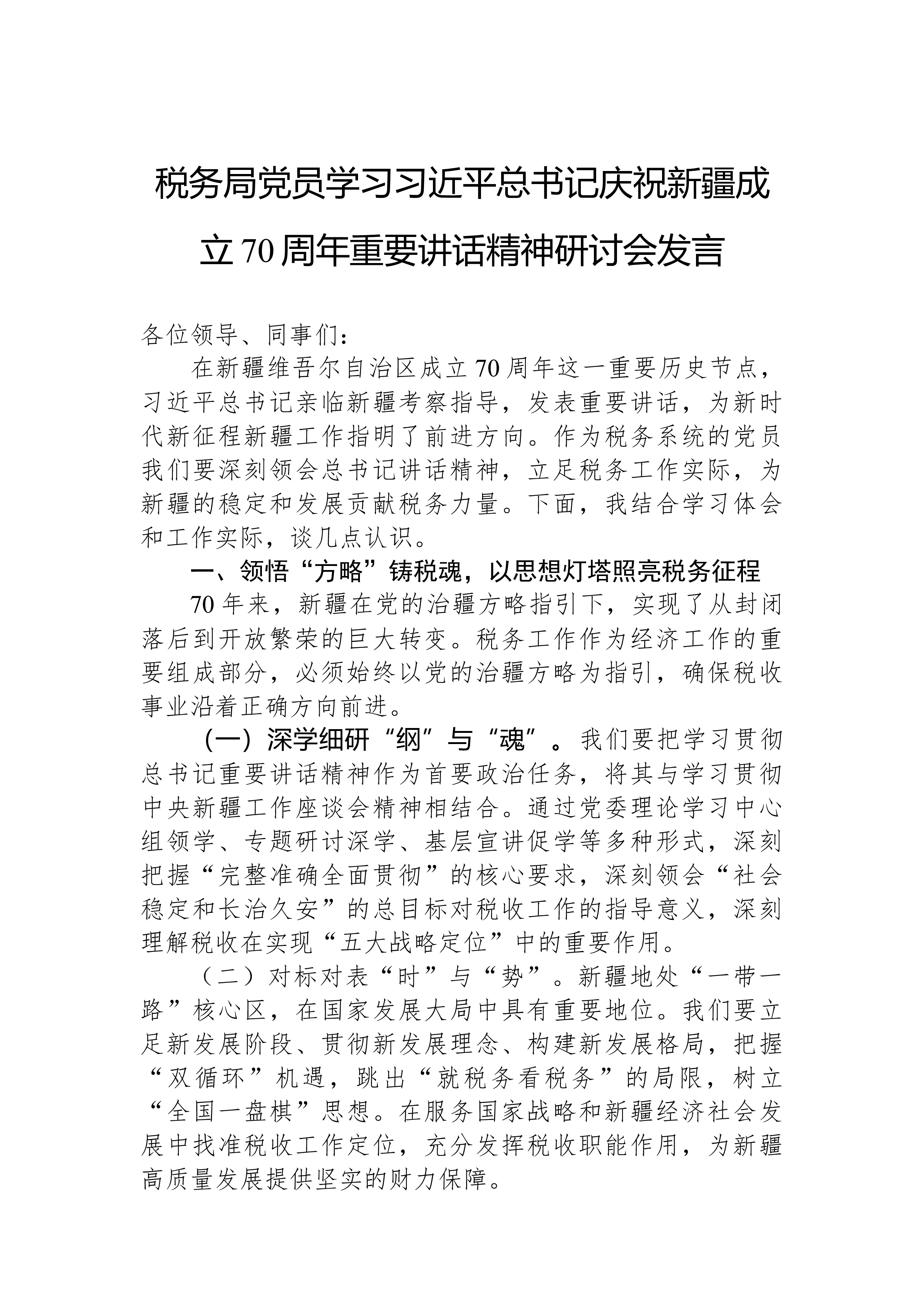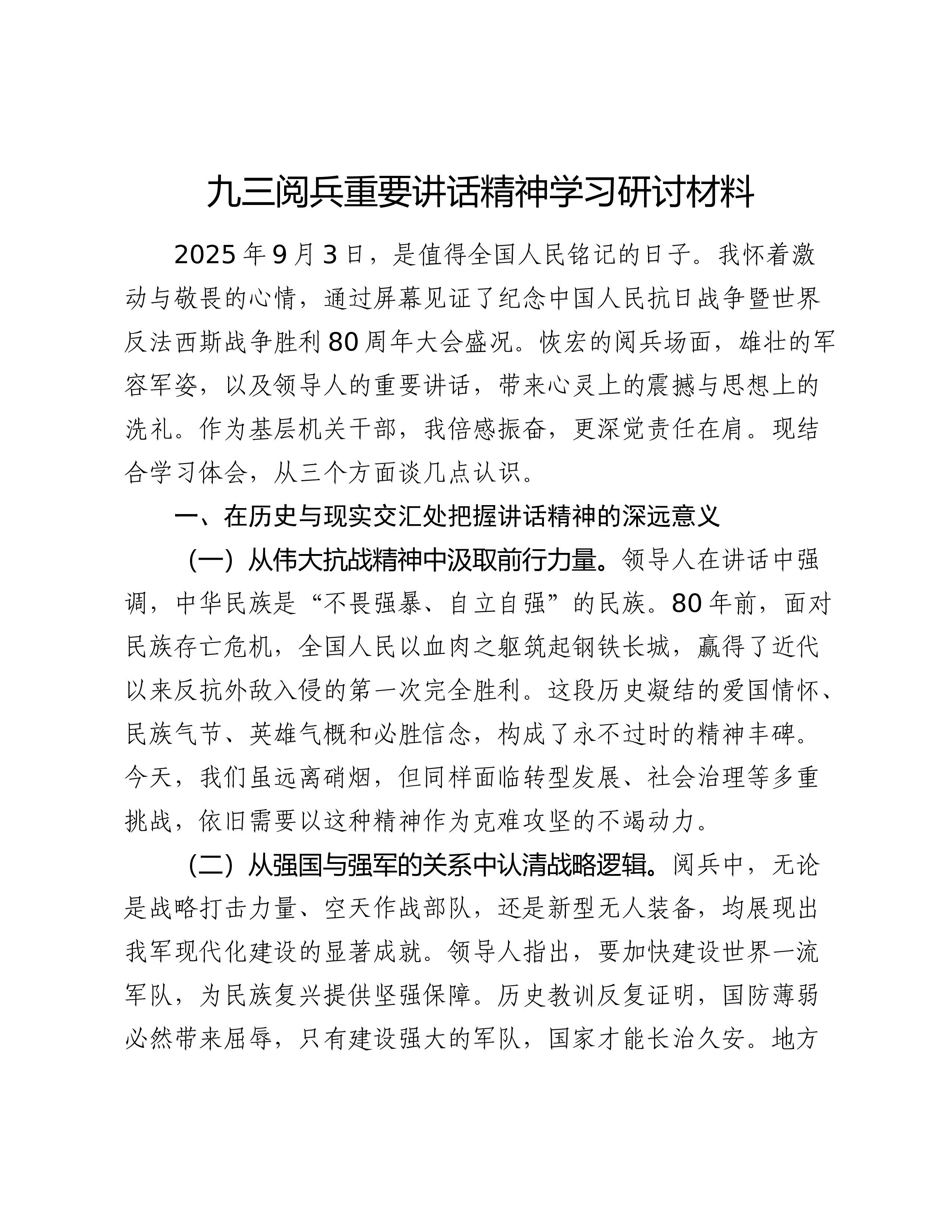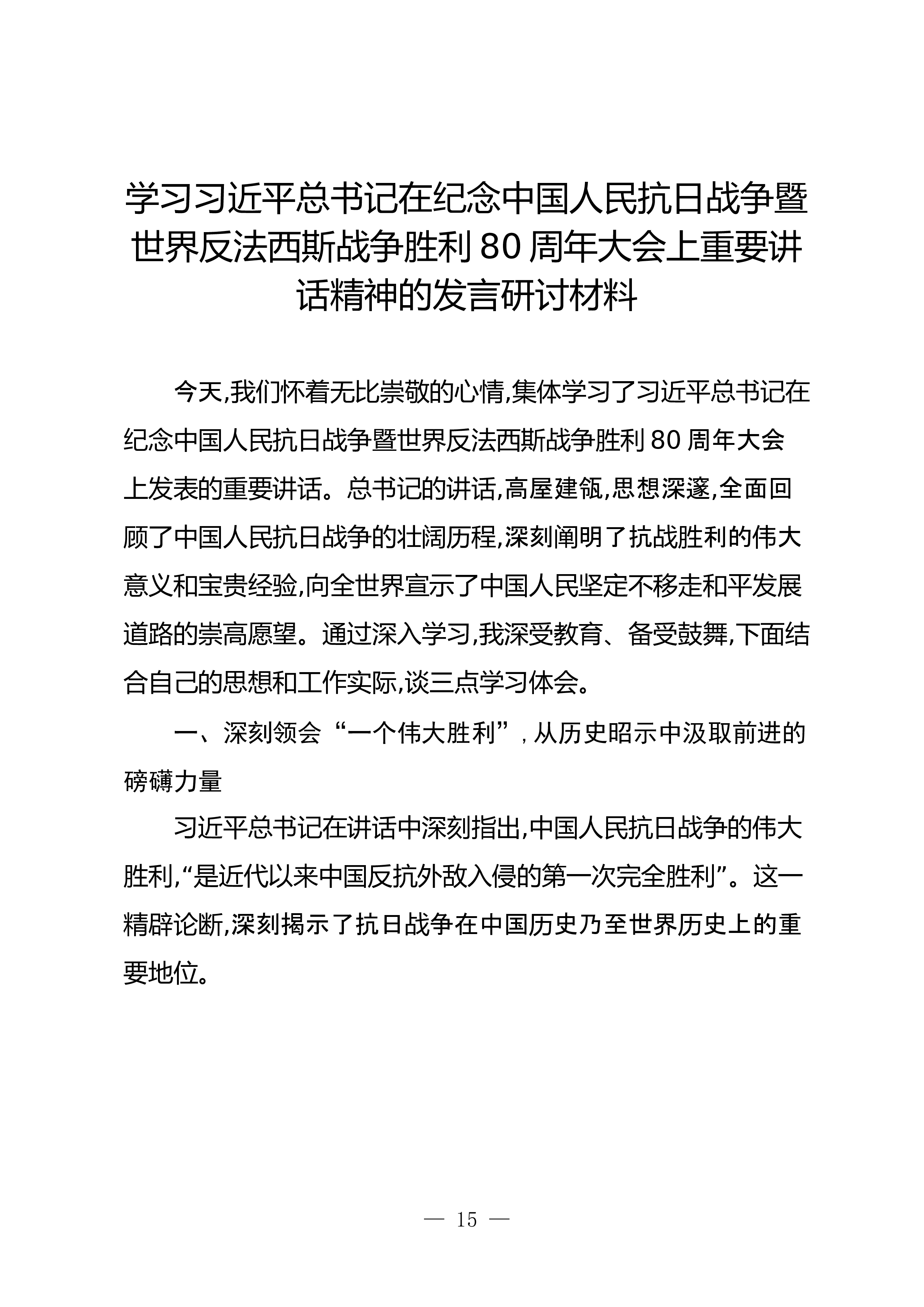 学习习近平总书记在纪念中国人民抗日战争暨世界反法西斯战争胜利80周年大会上重要讲话精神的发言研讨材料今天,我们怀着无比崇敬的心情,集体学习了习近平总书记在纪念中国人民抗日战争暨世界反法西斯战争胜利80周年大会上发表的重要讲话。总书记的讲话,高屋建瓴,思想深邃,全面回顾了中国人民抗日战争的壮阔历程,深刻明了抗利的大阐战胜伟意义和宝贵经验,向全世界宣示了中国人民坚定不移走和平发展道路的崇高愿望。通过深入学习,我深受教育、备受鼓舞,下面结合自己的思想和工作实际,谈三点学习体会。一、深刻领会“一个伟大胜利”,从历史昭示中汲取前进的磅礴力量习近平总书记在讲话中纪指出,中国人民抗日战争的伟大胜利,“”是近代以来中国反抗外敌入侵的第一次完全胜利。这一精辟论断,深刻揭示了抗日争在中国史乃至世界史上的重战历历...