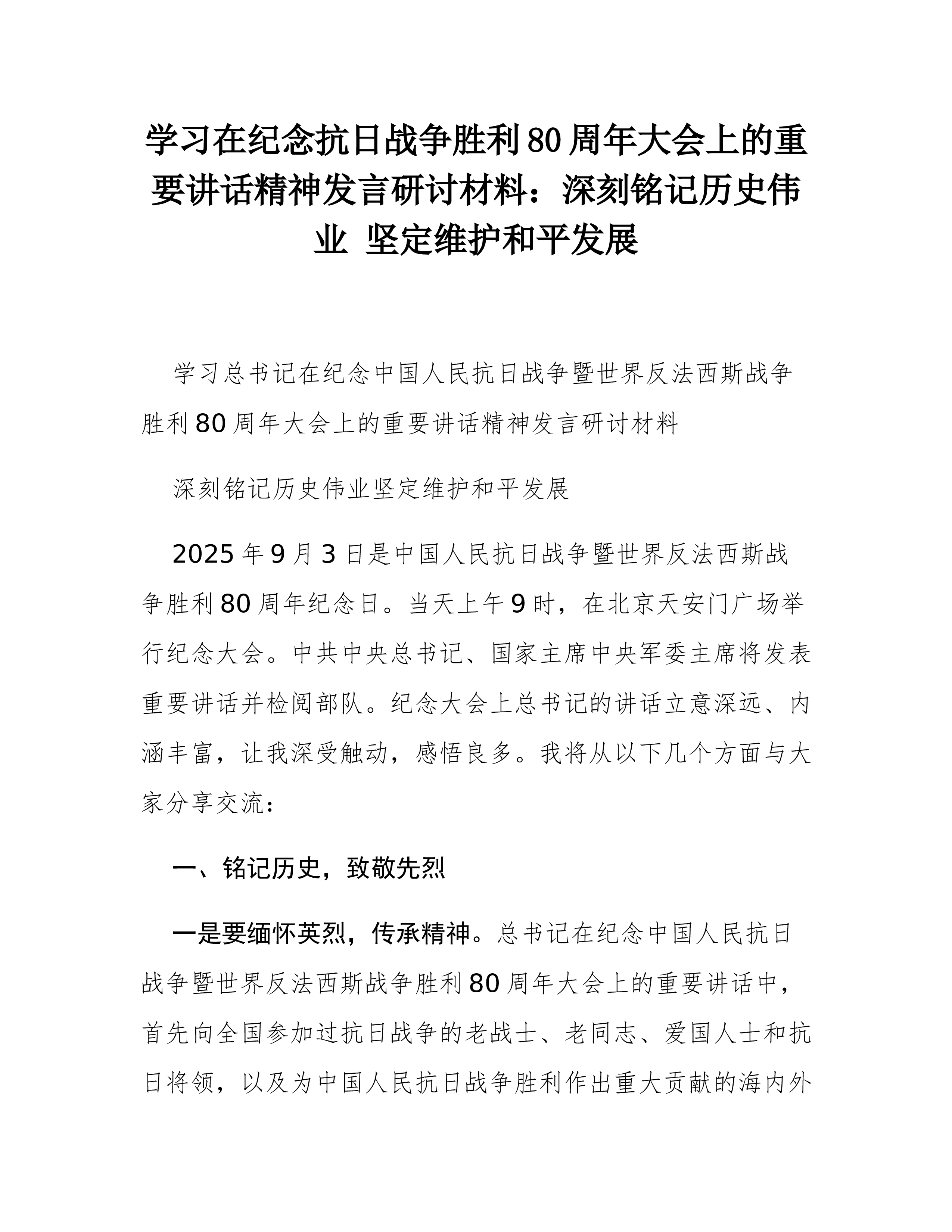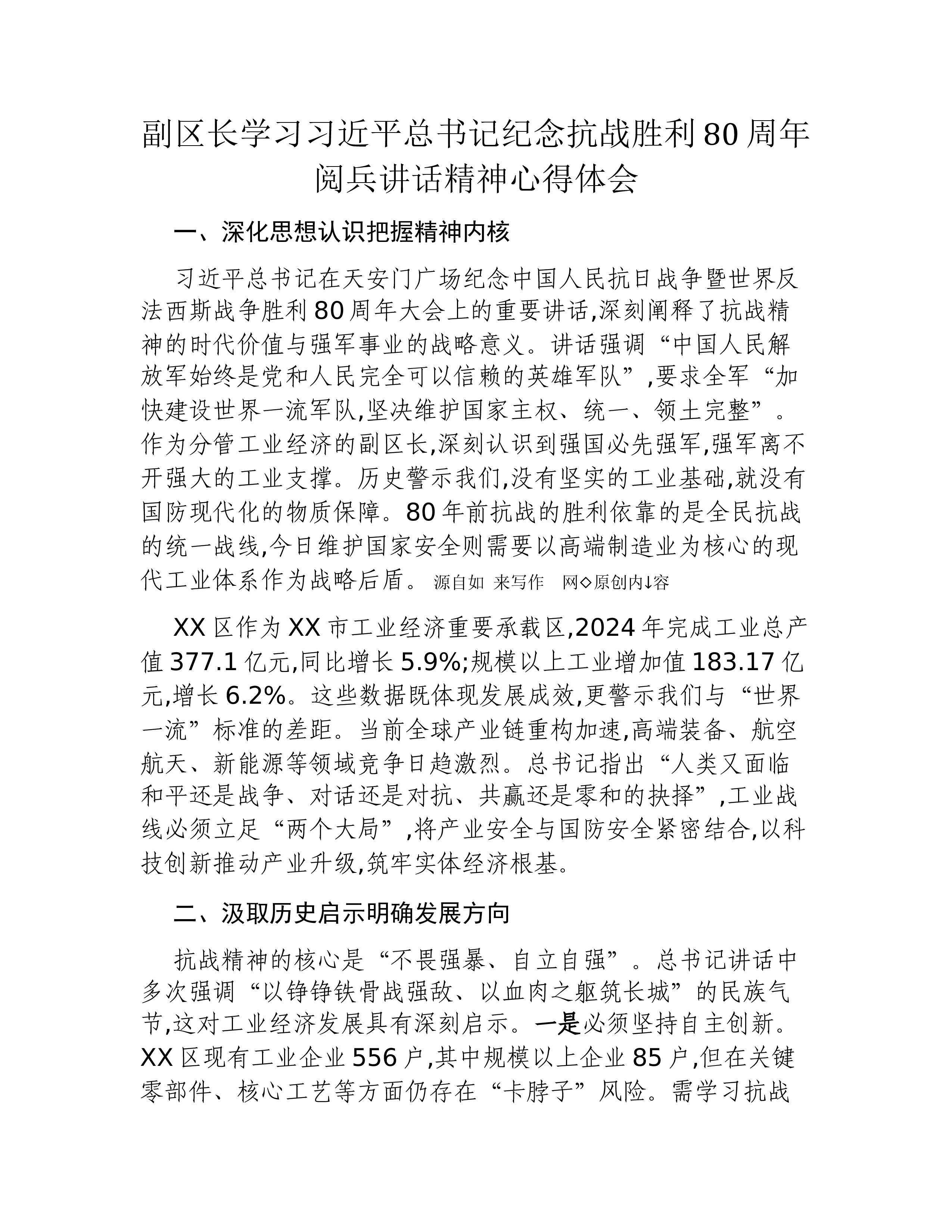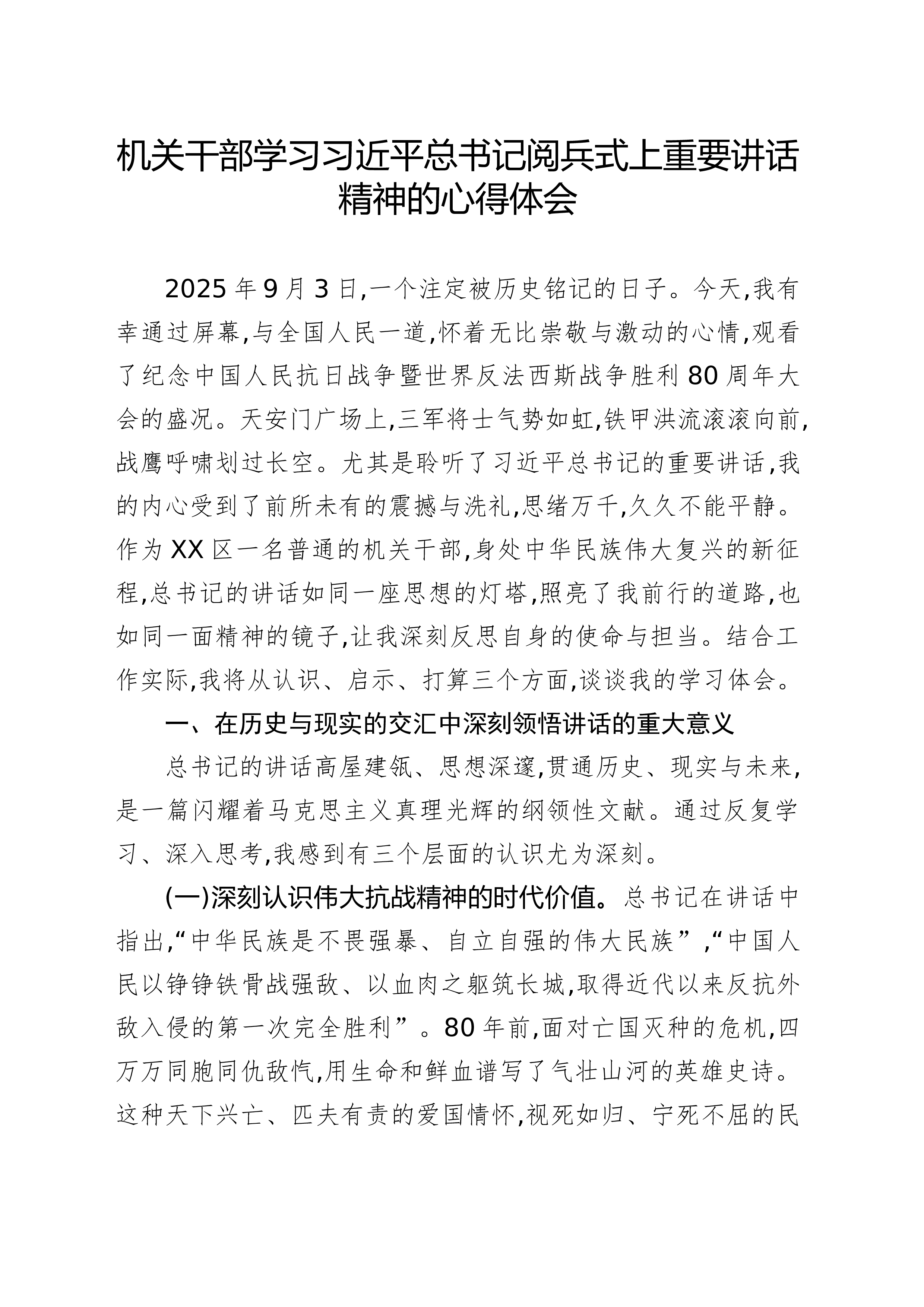 机关干部学习习近平总书记阅兵式上重要讲话精神的心得体会2025年9月3日,一个注定被历史铭记的日子。今天,我有幸通过屏幕,与全国人民一道,怀着无比崇敬与激动的心情,观看了纪念中国人民抗日战争暨世界反法西斯战争胜利80周年大会的盛况。天安门广场上,三军将士气势如虹,铁甲洪流滚滚向前,战鹰呼啸划过长空。尤其是聆听了习近平总书记的重要讲话,我的内心受到了前所未有的震撼与洗礼,思绪万千,久久不能平静。作为XX区一名普通的机关干部,身处中华民族伟大复兴的新征程,总书记的讲话如同一座思想的灯塔,照亮了我前行的道路,也如同一面精神的镜子,让我深刻反思自身的使命与担当。结合工作实际,我将从认识、启示、打算三个方面,谈谈我的学习体会。一、在历史与现实的交汇中深刻领悟讲话的重大意义总书记的讲话高屋建瓴、思想深邃...