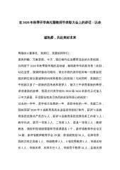 在2024年秋季开学典礼暨教师节表彰大会上的讲话:以赤诚热爱,共赴美好未来尊敬的X董事长、老师们,亲爱的同学们:惠风和畅,万象更新。今天,我们相约在这叠翠流金的大美校园,共同按下2024年秋季新学期的启动键,奏响新学年的新乐章!此刻,站在这里,我满怀激动与期待,请允许我代表学校向每一位重返校园的师生致以最诚挚的问候和最衷心的祝福!与此同时,美丽的三中校园又多了一群新的思考者和逐梦人,魅力三中孕育着新的希望,讲述着新的故事。我再次代表学校向2024级1624名新生正式加入三中大家庭、开启新征程表示热烈的欢迎和衷心的祝贺!过去的一学年,是学校大发展的一年、喜获丰收的一年。党建工作,我校荣获“202...
