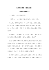 教师节朗诵稿(精选20篇)教师节朗诵稿篇1三寸粉笔,三尺讲台系国运;一颗丹心,一生秉烛铸民魂。祝各位老师节日快乐!有人说,教师的生命像一个长长的句子,艰辛是定语,耐心是状语,热情是补语;无私是谓语,奉献是宾语;也有人说,老师的生命像一个根号,叠叠作业为她的青春开无数次平方。而我要说:“教师如百合,展开是一朵花,凝聚成一枚果!教师似星晨,远望像一盏灯,近看是一团火!”是的,教师是普罗米修斯,不是精心传递知识的火种,岂能到达成功的彼岸?教师是蜂王,不是潜心设计蜂巢,辛勤劳作,岂能博采百花之粉,酿一家之蜜?教师是伯乐,不是慧眼识才,岂能把一支支雏鹰送上高高的云际?教师是春蚕,不是无私奉献,岂能把一根...