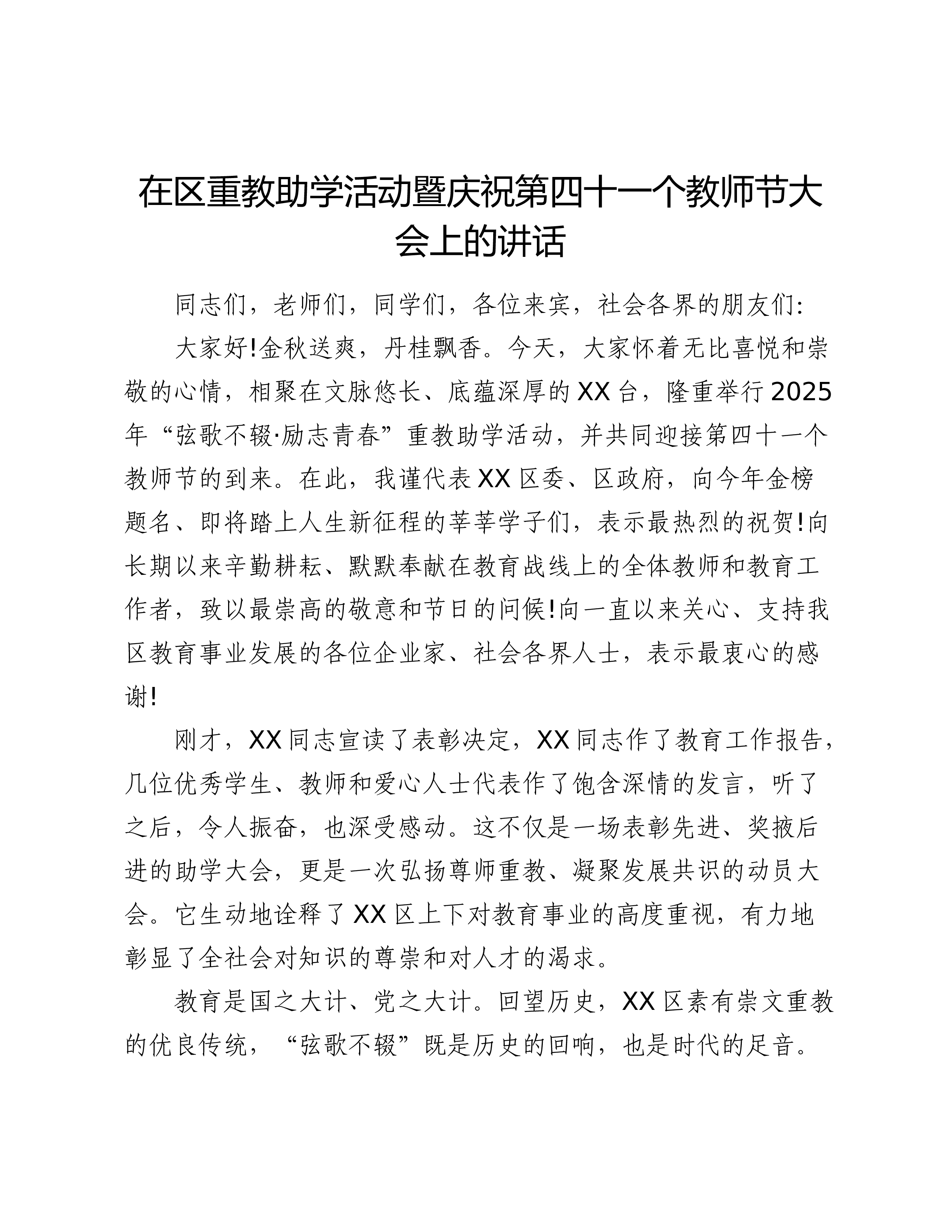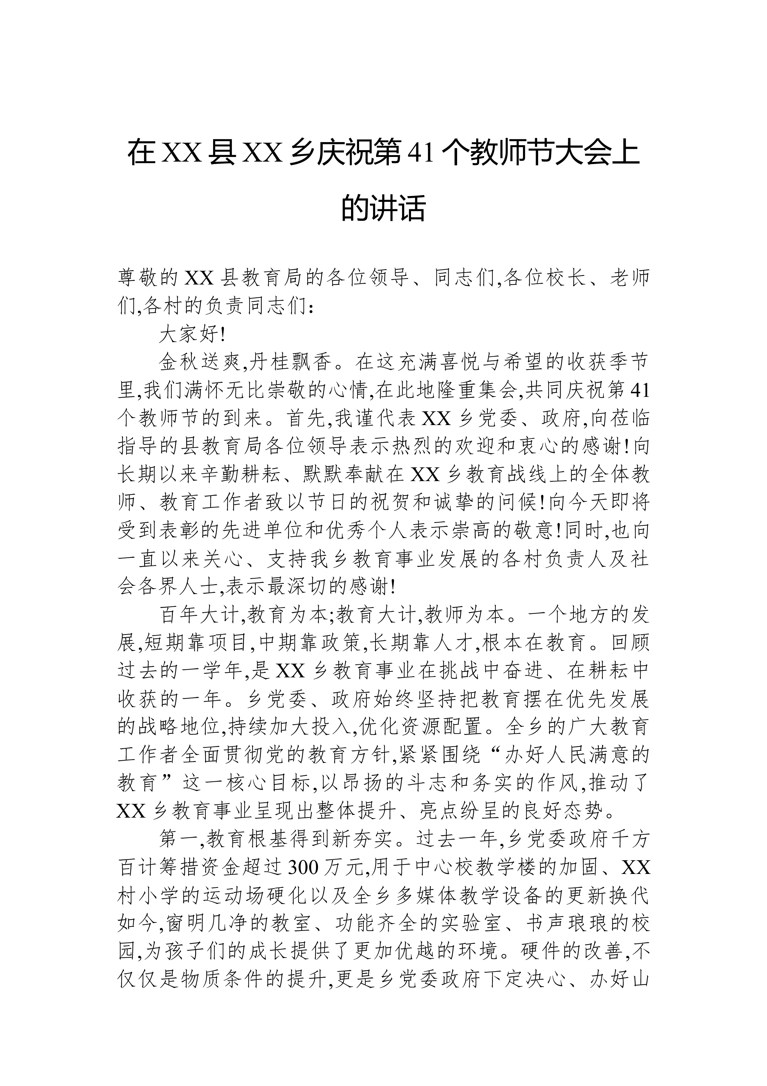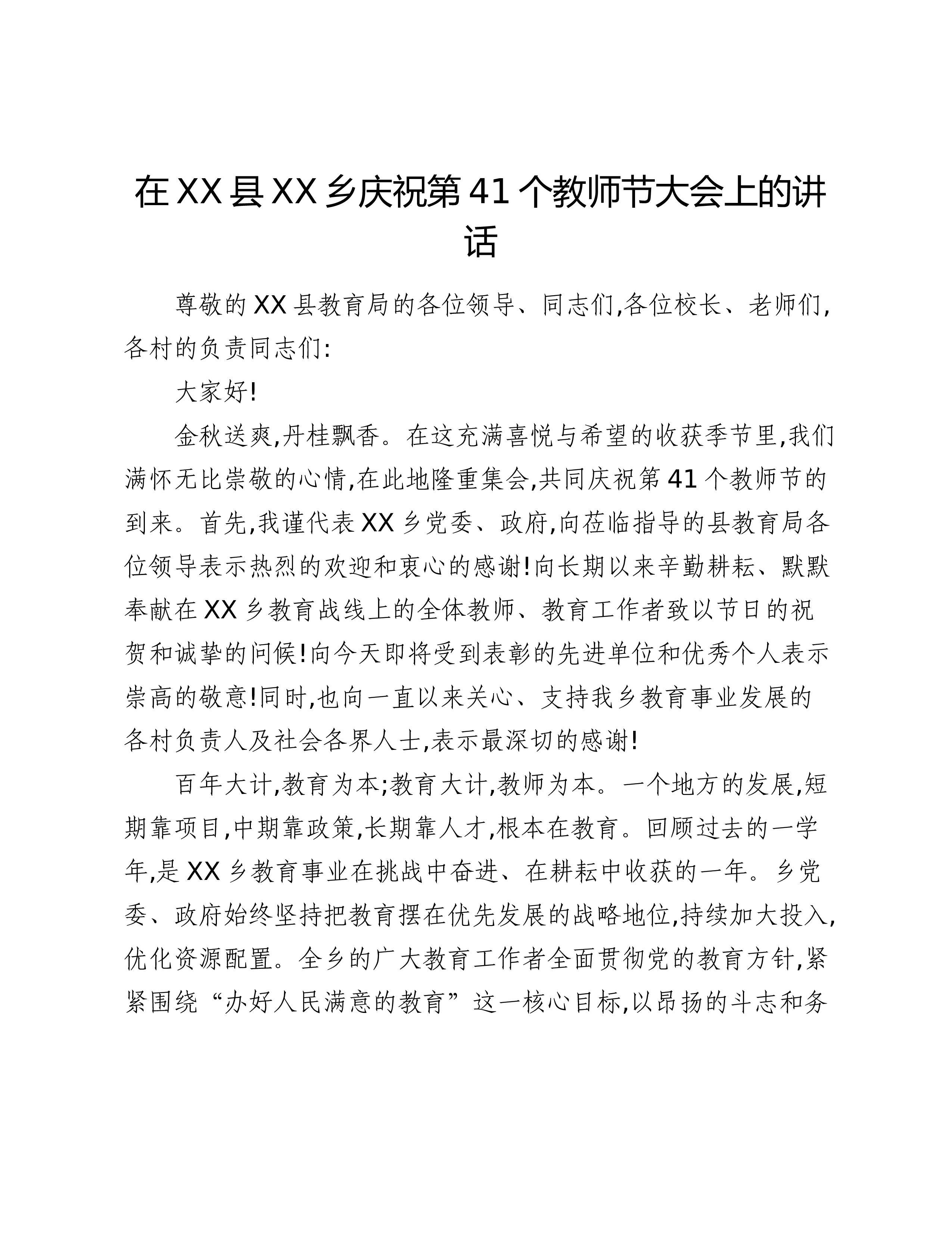 在XX县XX乡庆祝第41个教师节大会上的讲话尊敬的XX县教育局的各位领导、同志们,各位校长、老师们,各村的负责同志们:大家好!金秋送爽,丹桂飘香。在这充满喜悦与希望的收获季节里,我们满怀无比崇敬的心情,在此地隆重集会,共同庆祝第41个教师节的到来。首先,我谨代表XX乡党委、政府,向莅临指导的县教育局各位领导表示热烈的欢迎和衷心的感谢!向长期以来辛勤耕耘、默默奉献在XX乡教育战线上的全体教师、教育工作者致以节日的祝贺和诚挚的问候!向今天即将受到表彰的先进单位和优秀个人表示崇高的敬意!同时,也向一直以来关心、支持我乡教育事业发展的各村负责人及社会各界人士,表示最深切的感谢!百年大计,教育为本;教育大计,教师为本。一个地方的发展,短期靠项目,中期靠政策,长期靠人才,根本在教育。回顾过去的一学年,是...